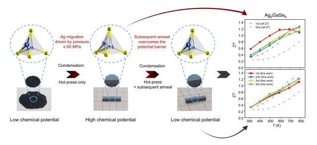 针对上述关键科学问题,51动漫 吴立明教授和陈玲教授课题组选取典型的类液态化合物(硫银锗矿Ag9GaSe6)为研究对象,首次在微观原子层面上发现压力诱导的不稳定性是导致材料性能不稳定的一个重要因素。借助单晶X-射线衍射技术和X-射线光电子价带谱分析技术,他们发现在多晶样品成型必经的热压烧结工艺过程中,在压力作用下Ag原子与配位Se原子间的势能发生改变,使得Ag原子从小空隙三配位位点迁移至大空隙四配位位点;这种迁移导致Ag 4d轨道的EVBM(edge of the valence band maximum)升高,进而升高化合物的化学势,加剧Ag9GaSe6的不稳定性;并导致热电性能不可重复测试。基于这些认识,他们提出:多晶样品经热压成型后,再经过简单的24小时惰性气氛下退火处理,Ag原子便可迁回热压处理前的晶体学位置,化合物的化学势也恢复至原有水平。该方法使得化合物得以保持本征的稳定性,并实现热电性能的可重复测试。他们还发现Cu/Te掺杂的样品亦符合上述机制。他们获得的Cu/Te掺杂Ag9GaSe6,经过反复6次测试,性能仍能保持ZT值1.4不变(800 K)。这种高稳定性、高ZT值,对该类材料而言,尚属首次实现。上述机制的发现为类液态材料的稳定性提升提供了新的研究思路和解决方案,也将进一步推进该类材料的实际应用。