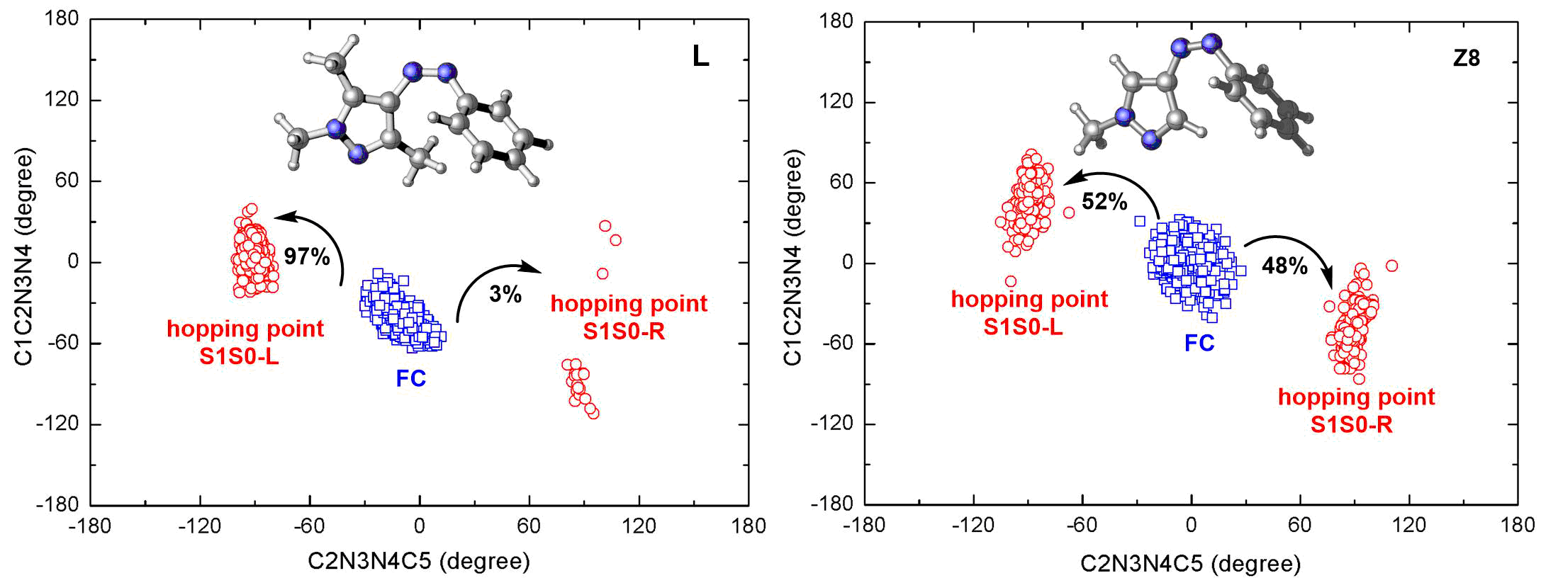 近期的实验研究发现一类新奇的五元芳香偶氮吡唑具有良好的光异构化效率及热稳定性,但其光异构化机理及动力学行为在原子水平上尚不清楚。最近,崔刚龙、方维海研究组和德国马普所Thiel教授合作,利用静态电子结构计算和非绝热动力学模拟,对两类芳香偶氮吡唑光开关化合物(Z11和Z8)的顺反光异构化机理和激发态衰减动力学进行了深入细致的研究,发现两条无势垒的S1激发态弛豫路径。动力学的分析显示Z11和Z8的激发态衰减具有迥异的性质。对于Z8,两种路径对S1激发态衰减的贡献相当(50% vs. 50%);然而对于Z11,两个手性构象几乎仅仅只采用其中一个S1弛豫路径来衰减(97% vs. 3%),具有专一的立体选择性。据他们所知,Z11芳香偶氮吡唑是发生立体专一的单方向激发态弛豫的首例化合物。他们也认为,由于芳香偶氮吡唑具有独特的光物理和光化学性质,这类光开关化合物将会有更加广阔的研究和应用前景。