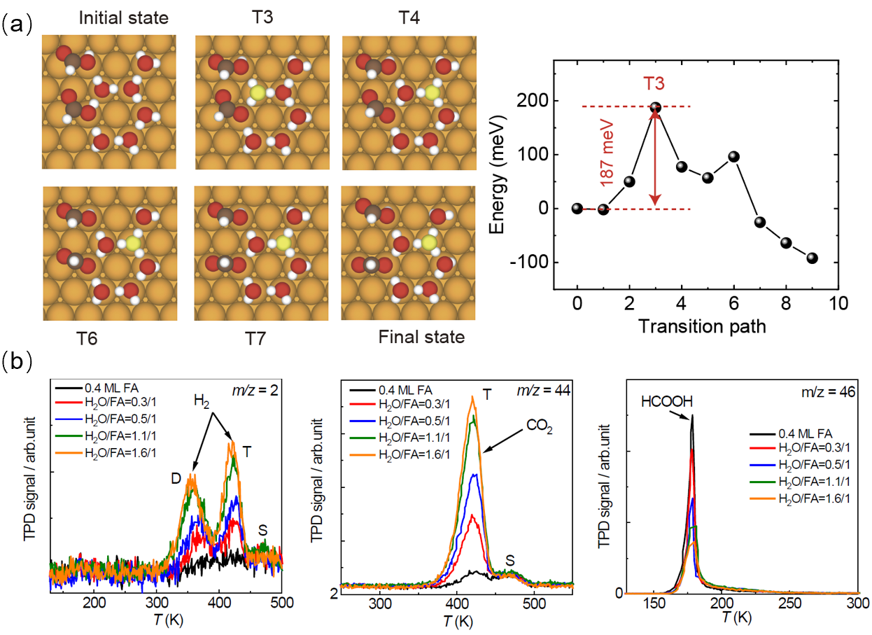 图3:机理研究。(a)理论计算水-甲酸氢键网络中质子转移过程和能垒。(b)Cu(111)表面水和甲酸共吸附的程序升温脱附图谱。