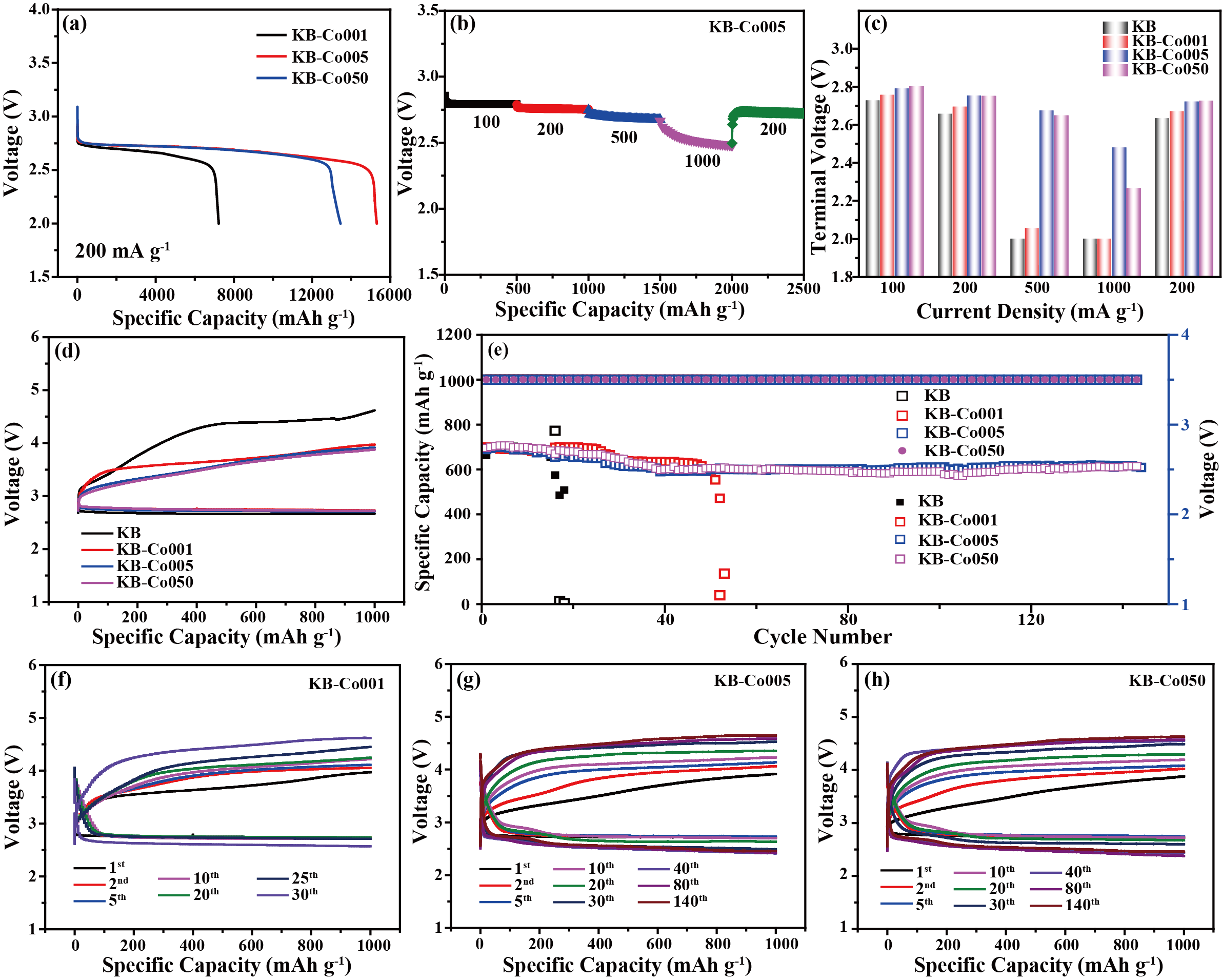 图3. 原子级KB-Co001、亚纳米级KB-Co005和纳米粒子级KB-Co050电催化剂的锂氧气电池性能