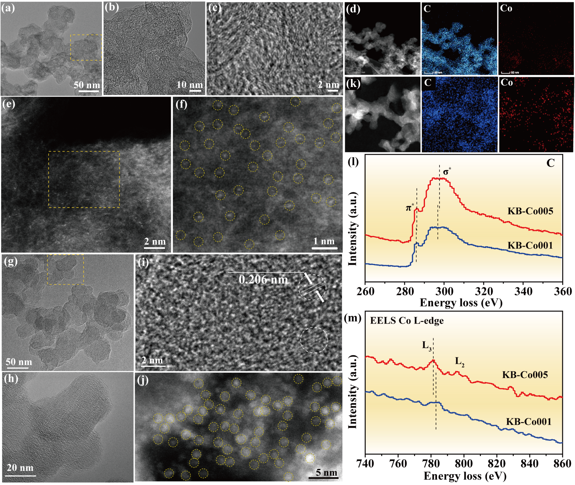 图2. 原子级KB-Co001和亚纳米级KB-Co005电催化剂的形貌结构分析