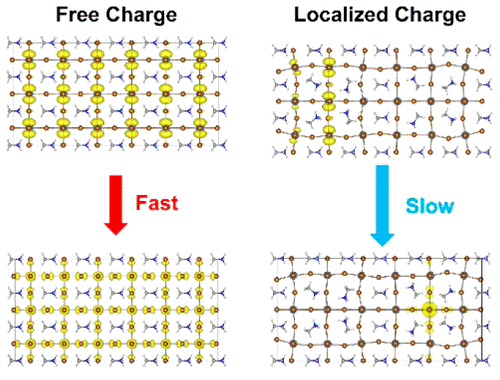 最近,龙闰老师课题组通过大量的静态电子结构计算,设计了由于MA分子旋转形成的自由电荷和局域电荷(极化子)两种MAPbBr3结构,分别对应带隙大、能量高和带隙小、能量低的体系。此前的理论计算也表明空穴和电子极化子的稳定能量只有0.06 eV和几个meV ,支持我们的假设——自由电荷和极化子可以共存,而室温(0.025 eV)提供的能量可以同时使电子和空穴极化子转变为自由电荷。基于电子结构计算发现和理性分析得出的结论,研究人员采用含时密度泛函理论结合非绝热动力学模拟,研究了两种结构的非辐射电子-空穴复合动力学。计算表明,带隙大、能量高的MAPbBr3结构(自由电荷)电子-空穴复合快;伴随着有机阳离子旋转,形成低能量的局域电荷MAPbBr3结构(极化子),电子-空穴复合慢。计算得到的时间尺度与实验十分吻合。复合时间尺度的差异是由非绝热耦合决定的。自由电子结构中,电子和空穴波函数重叠大,非绝热耦合强度强,故而复合快。反之,电子和空穴波函数在局域电荷结构中重叠小,非绝热耦合强度弱,因此复合慢。研究人员也采用爱因斯坦自然发射模型计算了两种结构辐射复合时间,与实验相差甚远。因此,研究人员推论有机分子重定向形成的自由电荷和局域电荷结构发生的非辐射电荷复合,分别对应延迟热荧光和正常荧光现象,为有机-无机杂化钙钛矿材料所发现的热荧光现象提供了一种可能解释 (J. Am. Chem. Soc. 2017, 139, 17327-17333)。