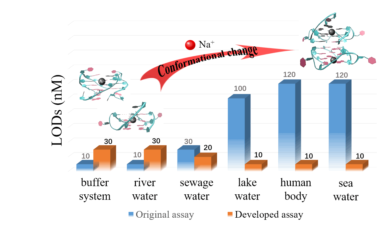 Pb2+可诱导富含鸟嘌呤的DNA适体链形成稳定的G-四链体二级结构。基于此,发展了一系列的光/电检测Pb2+的方法。但是,一旦涉及到实际水样中Pb2+的检测,检测方法的推广非常受限。考虑到实际水样中富含多种干扰离子或小分子,但最普遍的共存离子是Na+。因此,以Na+为例,探讨了Na+对Pb2+稳定G-四链体构型和性质的影响,结果发现:(1)钠离子可以诱导Pb2+稳定的G-四链体从反平行转化为平行构型,并且进一步发生二聚,这属于一个热力学驱动过程;(2)钠离子的存在虽然会增强Pb2+稳定的G-四链体与荧光小分子的结合能力从而增强其复合物的荧光,但是检测灵敏度大幅度降低,这也是检测方法难于推广的原因。于是,我们提出了一种适用于含Na+(0.3 mM ~ 500 mM)水体系中高灵敏检测Pb2+的方法。其他离子或小分子对G-四链体构型和性质的影响,正在研究中。