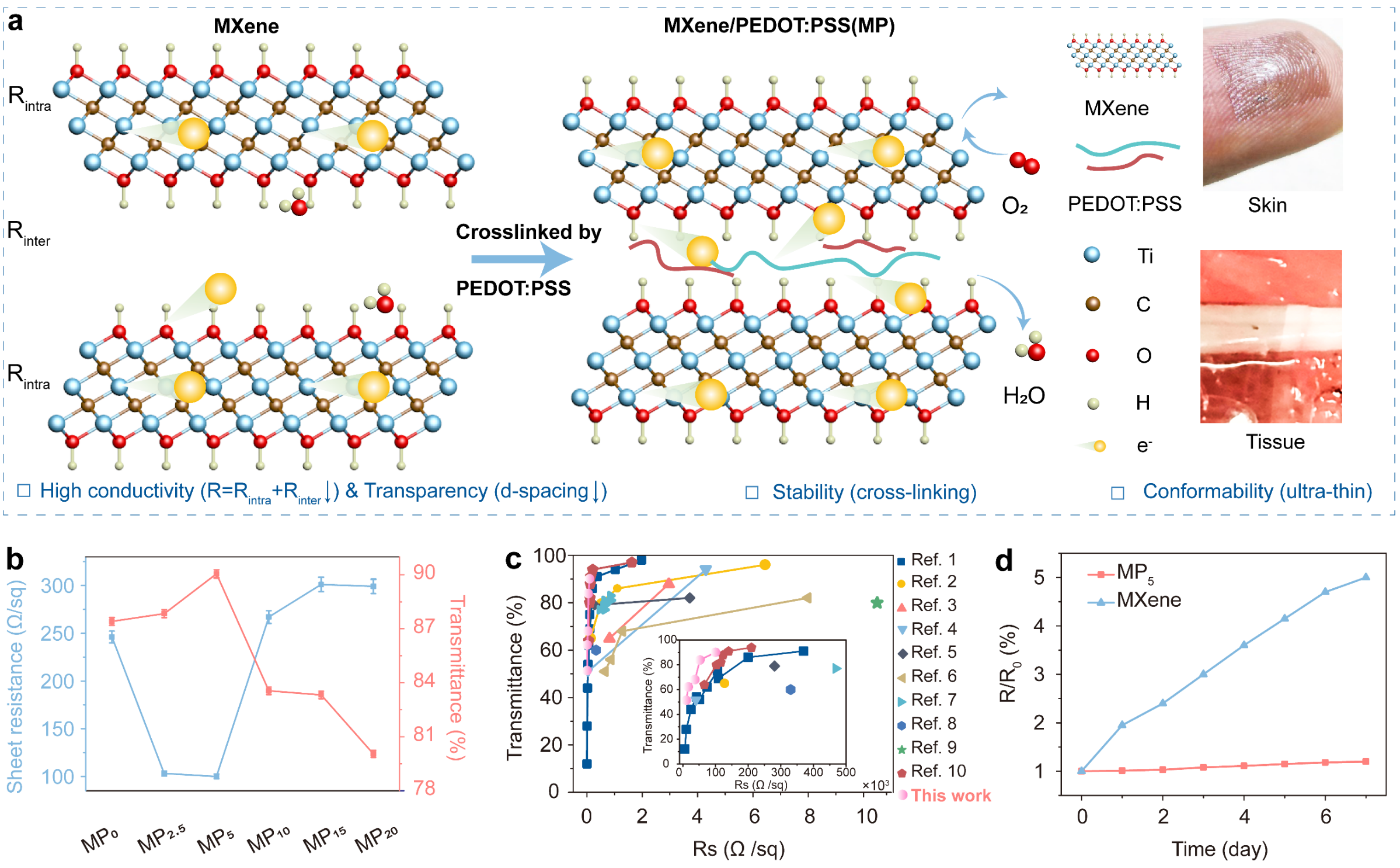 近日,51动漫 刘楠课题组报道了一种约20 nm厚的MXene薄膜,能够检测电生理信号且与MRI和fNIRS兼容。该薄膜由聚(3,4-乙烯二氧噻吩):聚苯乙烯磺酸盐(PEDOT:PSS)交联MXene制成,具有高电导率和透明度(11000 S/cm @ 89%)。其中,PEDOT:PSS不仅起到交联稳定MXene薄膜的作用,而且缩短了层间距离,实现了有效的电荷转移和高透明度。因此,它可以实现与皮肤或神经表面的低界面阻抗,以准确记录电生理信号(图1)。