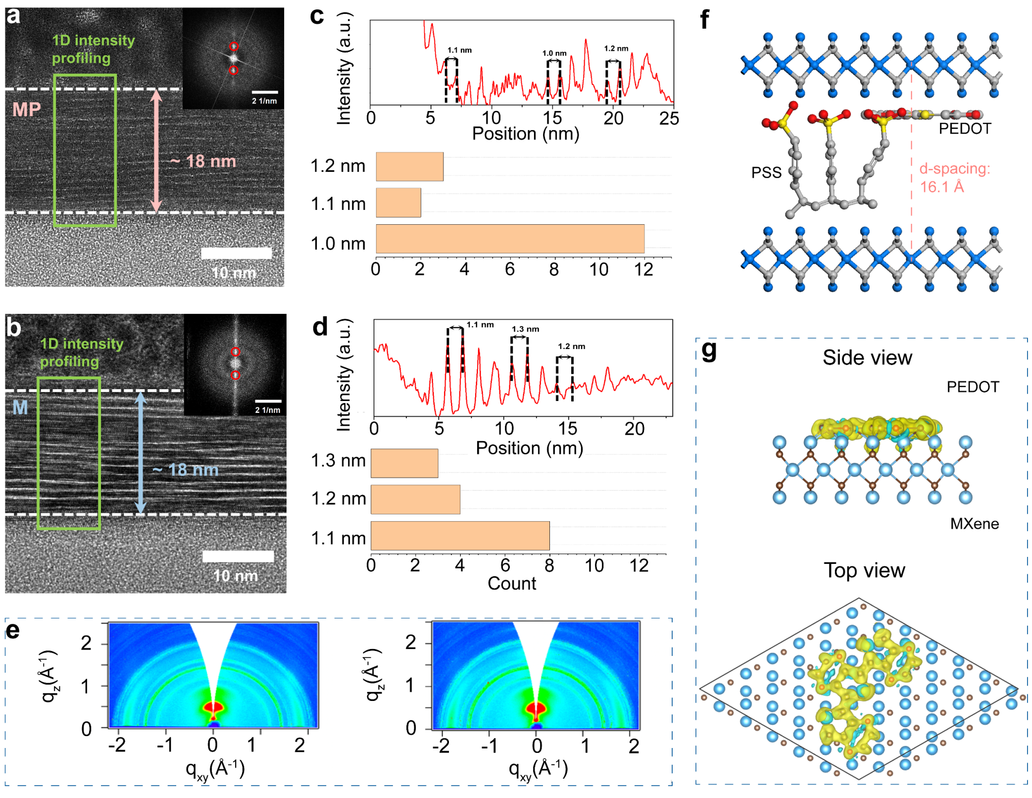 通过聚焦离子束刻蚀-高分辨透射电子显微镜(FIB-HRTEM)以及掠入射广角X射线散射(GIWAXS)等多种实验手段证明PEDOT:PSS交联前后的MXene层间距离及排列变化。为进一步理解层间交联的机制,还通过密度泛函理论(DFT)计算,深入研究了MXene与PEDOT:PSS的相互作用机理(图2)。