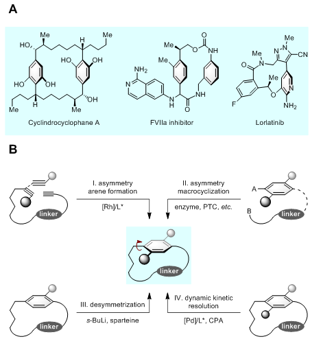 环蕃烷(英文名,cyclophane)是指含有芳环和交叉连接的烷烃链(亦称ansa链)结构的分子。当芳香环上含有较大取代基且ansa链长度合适时,芳环平面围绕大环面的旋转受阻,其对称性发生破缺,从而产生平面手性。近年来,基于平面手性环蕃烷优势骨架的药物分子设计受到广泛关注,并取得了重要进展。构效关系研究表明,平面手性环蕃烷的构象稳定性对药物分子的活性具有较大影响。因此,发展催化不对称合成平面手性环蕃烷分子的新方法、并研究其构象稳定性,无疑对相关药物分子设计具有重要意义(图1A)。目前,可以将平面手性环蕃烷的催化不对称合成主要分为以下几类策略:Ⅰ)立体选择性环加成反应构建芳环;Ⅱ)立体选择性大环化反应;Ⅲ)去对称化;Ⅳ)动力学拆分等(图1B)。催化不对称构建平面手性环蕃烷已经取得一定的进展,但是通过对芳环的后期修饰高效构建平面手性环蕃烷的策略研究相对较少,且具有明显的局限性。