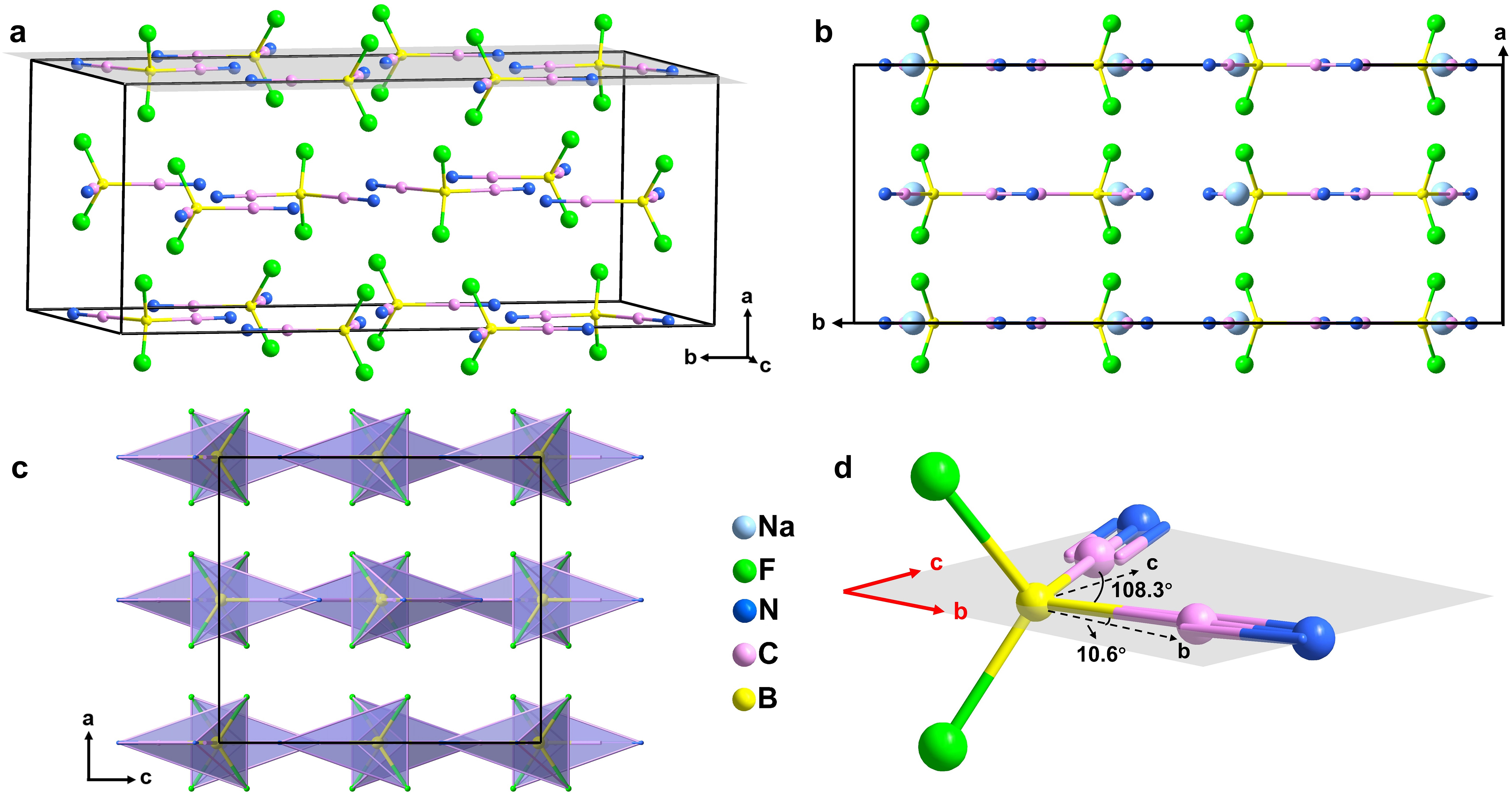 如何开拓具有更大成键差异的ABUCBs具有极高的挑战性。针对这个问题,本工作开创性地利用线性π基团构建ABUCB,获得了氟化二氰基硼酸钠(Na[BF2(CN)2])晶体。图2显示,Na[BF2(CN)2]由Na⁺阳离子和[BF2(CN)2]⁻阴离子组成,每个晶胞包含八个独立的[BF2(CN)2]四面体,这些四面体具有特定的排列方式,使得[BF2(CN)2]四面体中所有的(CN) π基团都规则地平铺于(100)平面,因而表现出显著增强的光学各向异性。该材料创造了当前DUV材料最高的双折射率记录,其观测值Δnobv.达到0.152,分别比目前商用材料α-BBO和MgF2高出35%和1167%。由于ABUCBs构筑基元中仅存在双原子线性π基团,相比α-BBO中B3O63-六原子π基团的π电子离域程度大大降低。使得材料的截止波长λcut-off仅为174.3 nm,比α-BBO蓝移14.7 nm。密度泛函理论分析进一步阐明,线性π基团的引入,不仅确保了深紫外波段的透明度,还显著增强了极化各向异性。该工作被审稿人称为“groundbreaking”了传统ABUCBs构建思路,为打破DUV双折射率最高记录,提供了无限可能。