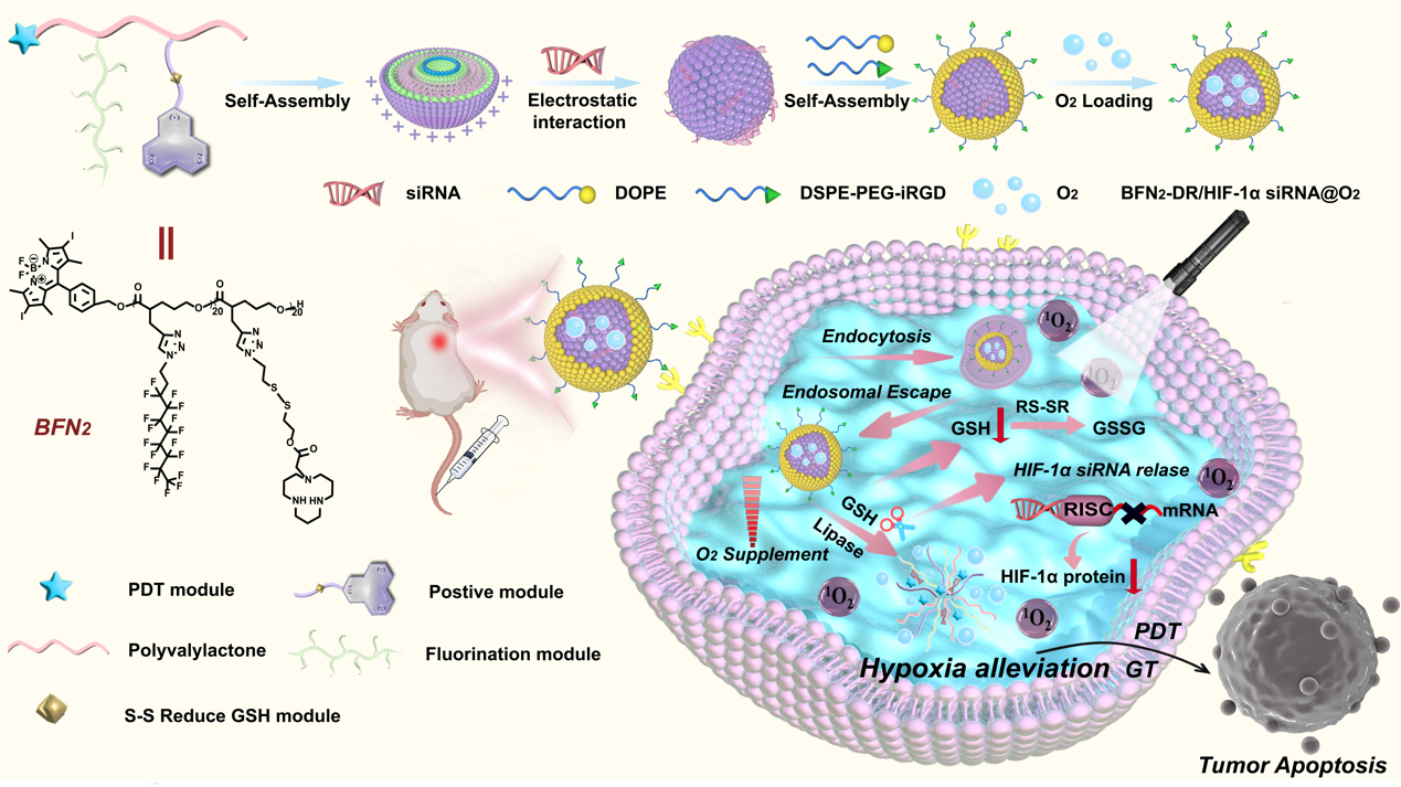 51动漫 卢忠林教授课题组一直从事非病毒基因载体的设计合成,并系统深入研究多功能载体在核酸和化疗药物递送方面的性能及其肿瘤协同治疗。近期,针对上述难题,该课题组报道了一种创新性多功能聚酯纳米平台—BFN₂-DR/HIF-1α siRNA@O₂。该平台通过模块化设计,将光敏剂 BODIPY、携氧全氟碳链、GSH响应性RNA凝聚单元[12]aneN₃,以及靶向肽iRGD整合于单一聚合物载体中,自组装形成的杂合纳米粒子可高效携带氧气并负载HIF-1α siRNA。在肿瘤微环境中,该纳米粒子不仅能释放氧气逆转缺氧,还可通过光动力作用产生活性氧破坏溶酶体,促进 siRNA逃逸并沉默HIF-1α基因,形成 “缓解缺氧-增强光动力-基因沉默”的协同效应。