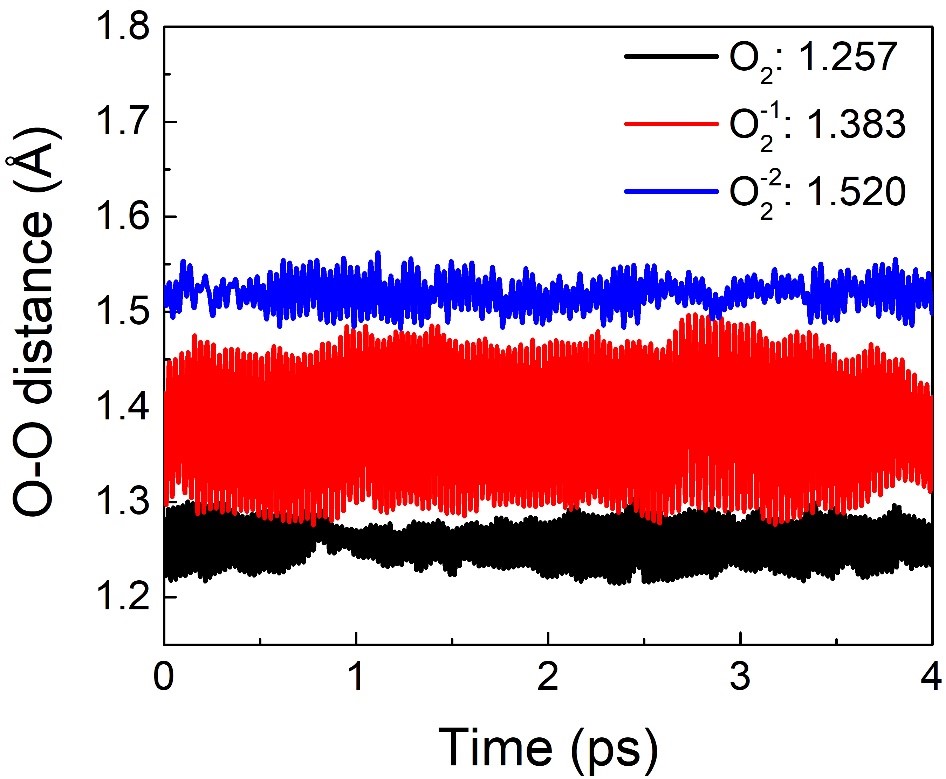 图1. 中性O2, 超氧(O2-1),过氧(O2-2)掺杂的MAPbI3体系分子动力学轨迹的O-O距离随时间的演化关系。插图的数值表示300 K时O−O距离的系综平均值。