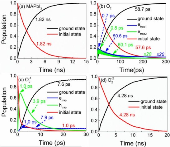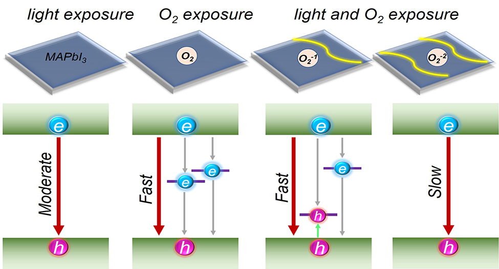 众多实验报道,黑暗条件下,氧气对MAPbI3(MA=CH3NH3+)稳定性无明显不利影响,但激发态寿命显著下降;光照条件下,氧气加快钙钛矿降解,但激发态寿命呈现复杂情形:部分实验报导激发态寿命迅速降低,还有一部分实验报导MAPbI3暴露在氧气中,载流子寿命显著提升。这些实验事实表明,中性O2捕获一个或两个光激发MAPbI3电子,转化为超氧 O2-1和过氧O2-2,它们均降低MAPbI3的稳定性,孰轻孰重未知。同时,氧的具体物种对MAPbI3激发寿命正面和负面影响的内在机制不清楚。