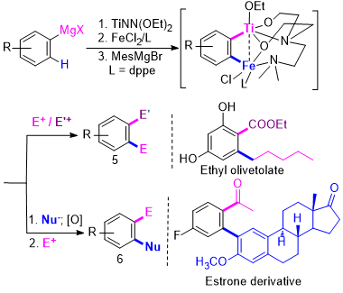 在芳烃相邻的两个碳上引入两个不同的官能团是有机化学中一项重要的转变,也是构建多取代芳烃及多环芳烃的高效手段。常见的方法有苯炔法和Catellani反应,利用这两种方法,可实现Nu/E型双官能团化;邻位双金属试剂则可实现E/E'型双官能团化。由于制备过程中易形成苯炔,邻位双金属试剂的制备和应用还非常有限,为数不多的几个实例也仅局限于含同种金属的试剂,如双Zn,双Al等试剂。到目前为止,含有过渡金属如Fe,Ti,Pd等邻位双金属试剂还未见报道,其中一个重要的原因可能是在形成邻位双金属络合物过程中,这些过渡金属容易形成苯炔络合物。