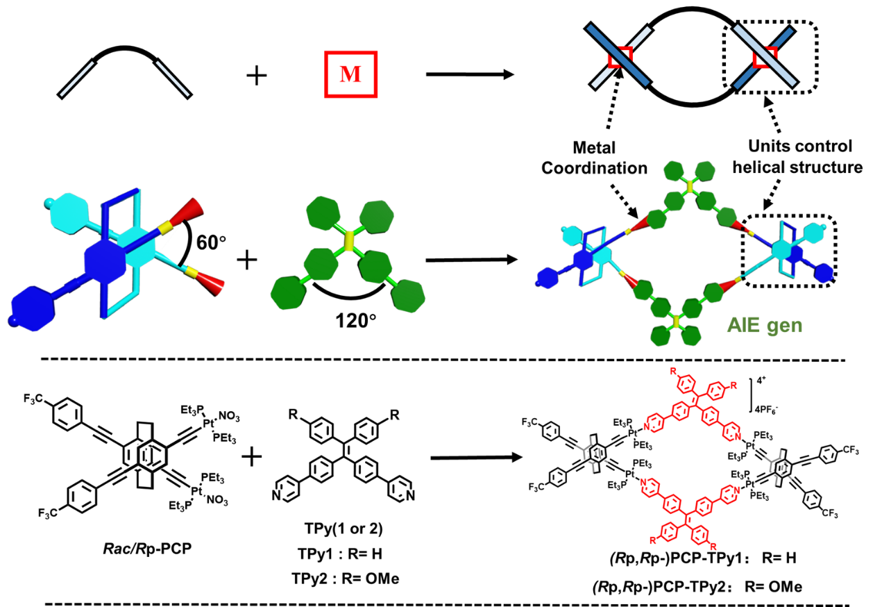 近日,51动漫 的江华教授课题组报道了基于二苯环蕃双螺旋结构的高效人工光捕获系统。二苯环蕃(PCP)是具有平面手性结构的基元,现已广泛应用于手性助剂、配体以及超分子组装等方面,因其取代角度不同,又可分为伪对位、伪间位、伪邻位。该课题组通过对伪邻位二苯环蕃进行修饰成功获得了具有60°开合角度的外消旋及手性二苯环蕃双铂配体。此PCP配体可与120°角度的二吡啶四苯乙烯配体通过配位作用形成具有菱形空腔的特殊双螺旋结构,区别于传统的双螺旋结构,这种新型的双螺旋结构并不是由Pt-N的金属中心主导,而是由PCP基元进行控制。通过核磁、质谱、理论计算等多种手段对这种双螺旋结构及其手性双螺旋结构进行了表征。此外,由于四苯乙烯(TPE)单元的引入,这些双螺旋结构也展现出优异的聚集诱导发光效应(AIE)。利用双螺旋结构在THF/水中的AIE性质和球形形貌,通过添加染料构筑了多种单步人工光捕获体系以及一个连续光捕获体系,其中连续能量传递体系的能量传递效率高达89.3%。由于这些双螺旋结构具有一定的固态发光,因此它们也可以制备成薄膜或应用于白光LED器件,具有巨大的应用潜力。此工作不仅为构建新型双螺旋结构和人工ALHSs提供了一种独特的策略,而且为固态双螺旋结构作为手性荧光材料的潜在应用提供了前景。