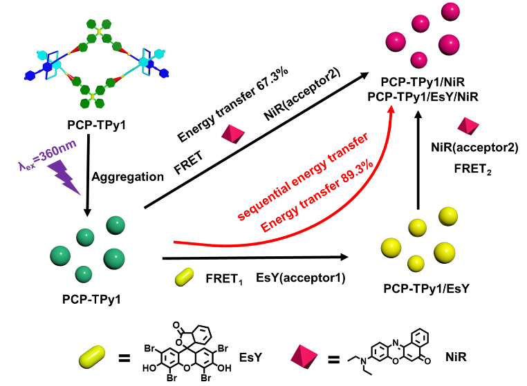 光合作用是许多植物以及绿色细菌赖以生存的重要生命活动,它可以高效的将太阳能转化为化学能并加以储存。受自然界光合作用的启发,许多研究学者投入了大量精力设计并构建了许多高效的人工光捕获系统(ALHSs)。现如今常见的光捕获体系主要是通过树突状分子,卟啉列阵,聚合物等进行构建。但是以上这些基元往往合成相对复杂并难以进行修饰,这大大限制了ALHSs的应用。因此设计合成新型的ALHSs并扩展其应用具有重要的意义。
