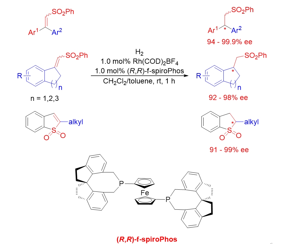 手性砜化合物是许多生物活性分子的重要结构单元和合成中间体,如可以用于合成香料ar-turmerone,天然产物(R)-curcuphenol和(S)-curcudiol,肾素抑制药Remikiren,γ-分泌酶抑制剂r-secretase inhibitor,炎性细胞因子抑制剂inflammatory cytokines inhibitor等等。除此之外,砜基团还可以通过烷基化、卤化、氧化、去砜化、Julia烯烃化等反应转化为很多其他有重要作用的官能团。因此,手性砜的制备成为科学家研究的热点。不对称催化氢化由于其原子经济性、环境友好性、高效高对映选择性、操作简单等优点受到科学家的高度关注。不饱和砜类化合物的不对称催化氢化也是合成手性砜类化合物的绿色快捷方法。但是,发展至今,不饱和砜(如3,3-二芳基不饱和砜,环状不饱和砜等)类化合物仍然是不对称催化氢化研究中尚未得到解决的底物类型。