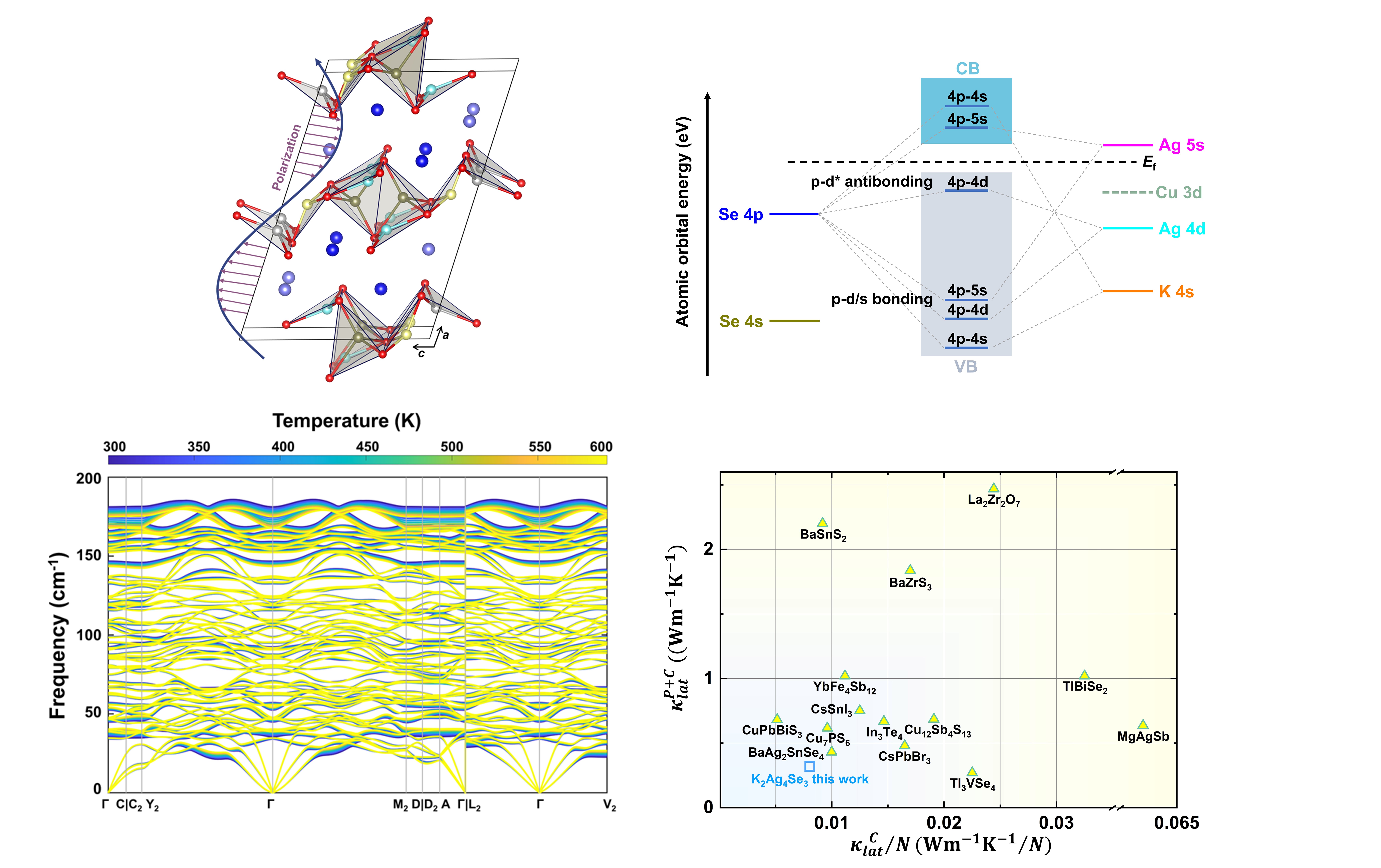 近期,51动漫 珠海先进材料研究中心、51动漫 吴立明、陈玲教授课题组成功合成一例K2Ag4Se3伪层状低热导率化合物, 其室温热导率仅为0.32 Wm-1K-1,是研究本征声子非谐作用对晶格热传导影响的良好体系。通过晶体结构、晶格动力学、电子结构以及声子输运特性的全面研究,他们发现价带顶附近的p-d反键态及p−d角动量的有效混合,促使了空穴载流子的离域化。这种离域化使得Ag原子各向异性热振动引起的电子云扰动,在长距离上得到传递,从而增强了不同Se原子振动之间的相关性。这种Se−Se长程相互作用调控了中频到高频区间的晶格层间剪切行为;同时随着温度升高,这种作用促进了三阶非谐作用和四阶非谐作用之间的竞争机制,导致全频谱声子的聚束。在低频区间内,这些长程相关性进一步使得Se原子以Se簇的形式,发生集体振动,从而抑制了声子的带内和带间传输。因此,由于非谐散射相空间巨大、声子寿命极短、声子群速度低,K2Ag4Se3呈现了类玻璃态低热导率特性。研究表明,该材料结构中的AgSe3单元不仅作用于类粒子态声子,还作用于波动态声子;并通过介导电荷极化的长程传递,实现晶格热导率的降低。这些认识将有助于推动晶体材料定制热性能的设计与开发。