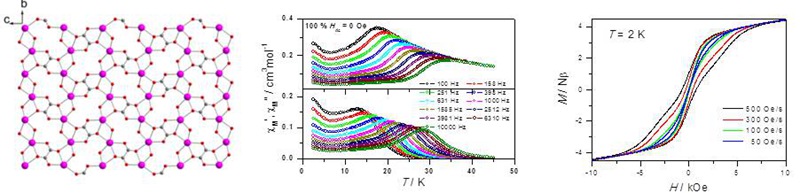 多维体系的磁弛豫研究是当前分子磁性的热点领域。孙豪岭课题组首次运用多种桥联配体相结合的方法组装得到了一个具有慢磁弛豫行为的二维层状配合物。磁性测量和理论计算的结果表明该配合物中镝(III)离子具有强的各向异性,并在低温具有慢磁弛豫行为,其能垒为目前羧酸-稀土体系最高(186K)。磁稀释研究表明该体系的慢磁弛豫行为来源于具有强各向异性的镝(III)离子的单离子磁行为,磁相互作用会抑制量子隧穿行为的发生。