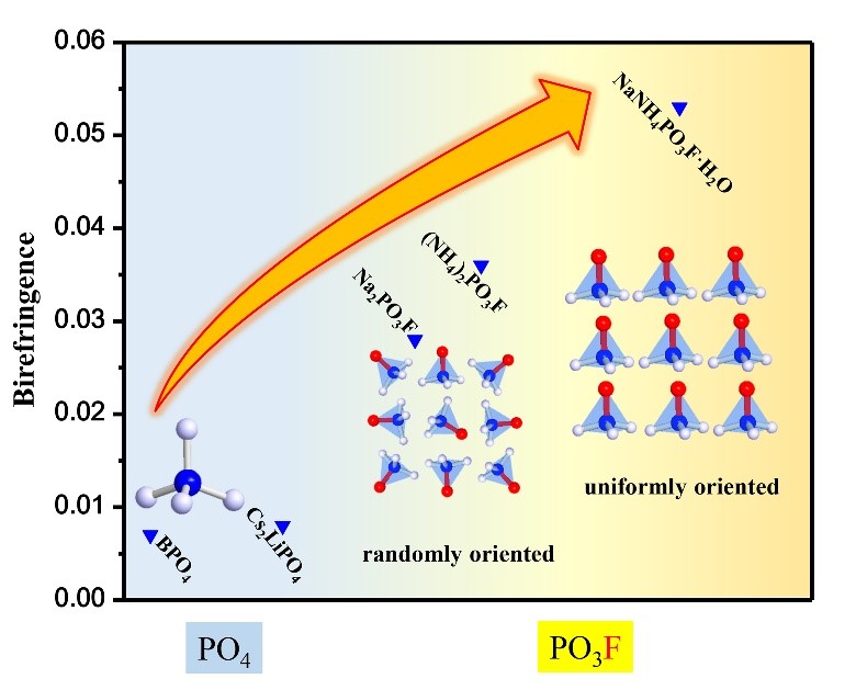 如何突破限制激光技术应用及微加工精度的所谓“200nm”墙的限制,取决于新颖高效的深紫外(DUV,λ < 200 nm)非线性光学(NLO)晶体的发现和创制。深紫外NLO晶体材料是是中国掌握的、处于国际领先地位的“卡脖子”科学技术之一。由于DUV倍频材料对材料的性质要求苛刻:要求材料同时具有非中心对称晶体结构、二阶倍频效应系数大、尤其是需具有超宽带隙(大于6.2 eV),因此,符合该要求的材料匮乏,商用材料仅有KBBF一例,但因其含铍元素,且大晶体生长困难等,其应用受到一定程度限制。因此新型深紫外非线性光学材料体系的探索研究具有重要的科学意义和实用价值。自2014年吴立明课题组,陈玲课题组报道首例磷酸盐深紫外二阶非线性光学化合物Ba3P3O10Cl以来(J. Am. Chem. Soc. 2014,136, 480–487.),磷酸盐成为新的深紫外非线性光学材料体系,得到了国内外的广泛关注,新颖高效磷酸盐深紫外NLO材料不断涌现,2018年吴立明课题组和陈玲课题组在J. Am. Chem. Soc.上发表的论文:反常的钡钛硅石结构化合物Ba2NaClP2O7: 从结构无序到相位匹配,该研究还入选了J. Am. Chem. Soc. Spotlights亮点评述(J. Am. Chem. Soc. 2018, 140, 14082-14086.)。但由于磷酸根的结构对称性,使得磷酸盐普遍存在双折射率偏小的问题,这限制了该类材料的相位匹配区间范围。为解决这个问题,2018年,吴立明课题组再次创新提出不对称性的氟磷酸盐有望成为深紫外非线性光学材料的思想,希望能解决磷酸盐微观四面体结构单元极化各向异性小的困难,他们首先从理论上预测单氟磷酸盐PO3F2-有望成为新的DUV NLO功能基团;并通过实验验证,获得(NH4)2PO3F,(C(NH2)3)2PO3F等新型单氟磷酸盐深紫外非线性光学材料(Chem. Mater. 2018, 30, 7823-7830.)。该研究得到《科学通报》亮点评述。然而氟磷酸盐由于氟磷酸根基团之间缺乏有效约束,其排列并具有随意性,并没有实现材料双折射大幅度提升。