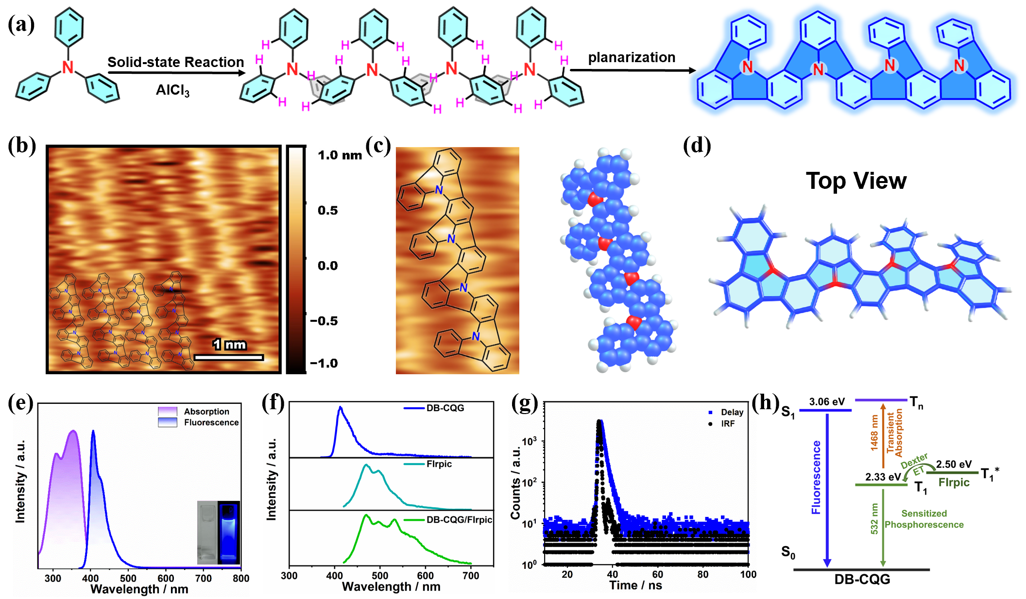 开发不含有毒金属元素、可溶液加工、高发光效率、高色纯度的新型电致发光材料对于实现高性能广色域显示技术具有重要的研究意义和潜在的商业价值。目前,蓝光发光二极管(LED)在色纯度、发光效率和光谱稳定性等方面的性能仍然落后于绿光和红光LED,这主要由于是蓝光LED所使用的发光材料带隙较大、存在更多非辐射复合损失、三重态激子利用效率低以及载流子传输不平衡等问题。近期,51动漫 张洋、范楼珍团队联合北京化工大学谭占鳌团队合成了氮掺杂齿条型结构的DB-CQG,在溶液中最大发射波长为406 nm,发射半峰宽为40 nm,荧光量子产率为80%,荧光寿命为1.31 ns,并展现出热激子发光性质。高分辨原子力显微镜(AFM)表征显示出DB-CQG具有准平面构型,平均长度为1.9 nm。理论计算进一步表明DB-CQG结构中形成的相邻氮杂五元环结构是实现深蓝光发射和获得高荧光量子产率的重要前提。