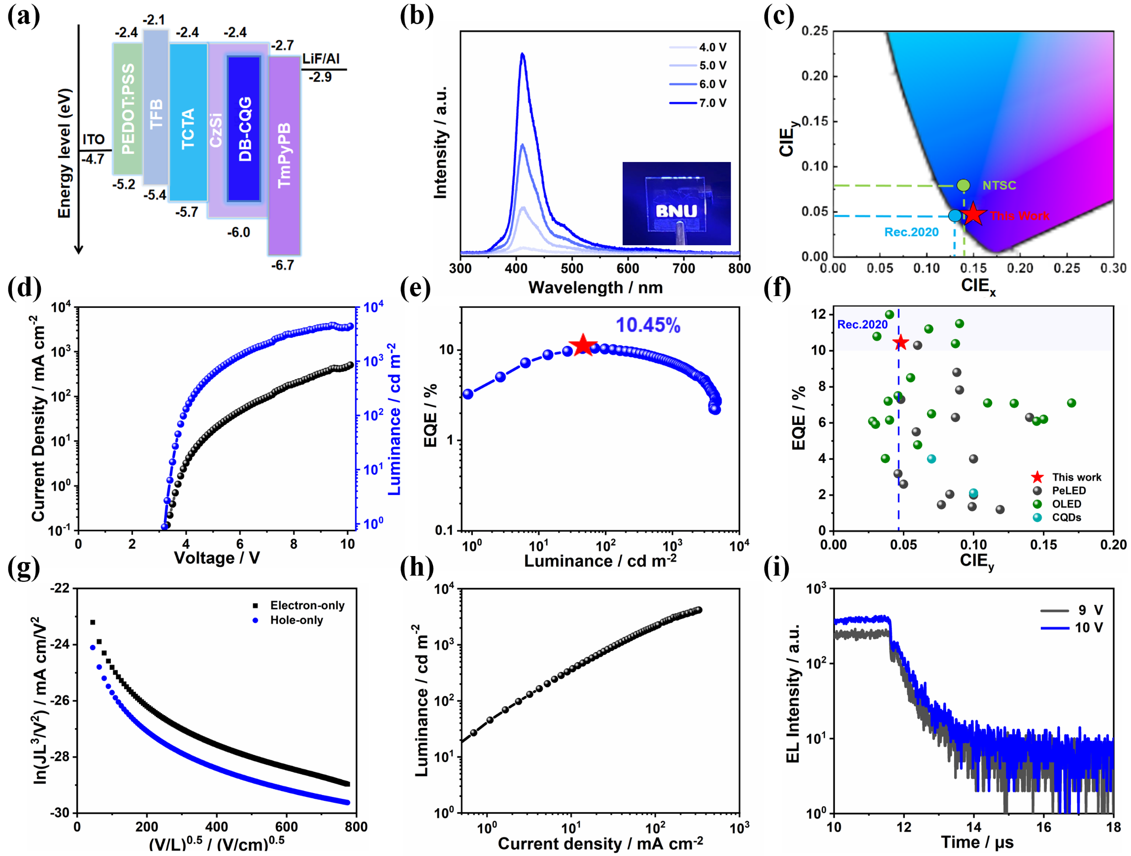 将DB-CQG作为客体材料掺杂在主体材料9-(4-叔丁基苯基)-3,6-双(三苯基甲硅烷基)-9H-咔唑中作为发光层,通过溶液加工法制备了深蓝光电致发光器件。电致光谱显示出较好的色纯度与稳定性,电致光谱对应的CIE色度坐标为(0.15, 0.048),接近Rec.2020中对于蓝光的CIE坐标要求(0.141, 0.046),器件最大亮度为4560 cd m-2,最大外量子效率超过了10%,这项工作为设计合成兼具宽带隙、高发光效率和热激子性质的新型碳量子电材料提供了新思路。