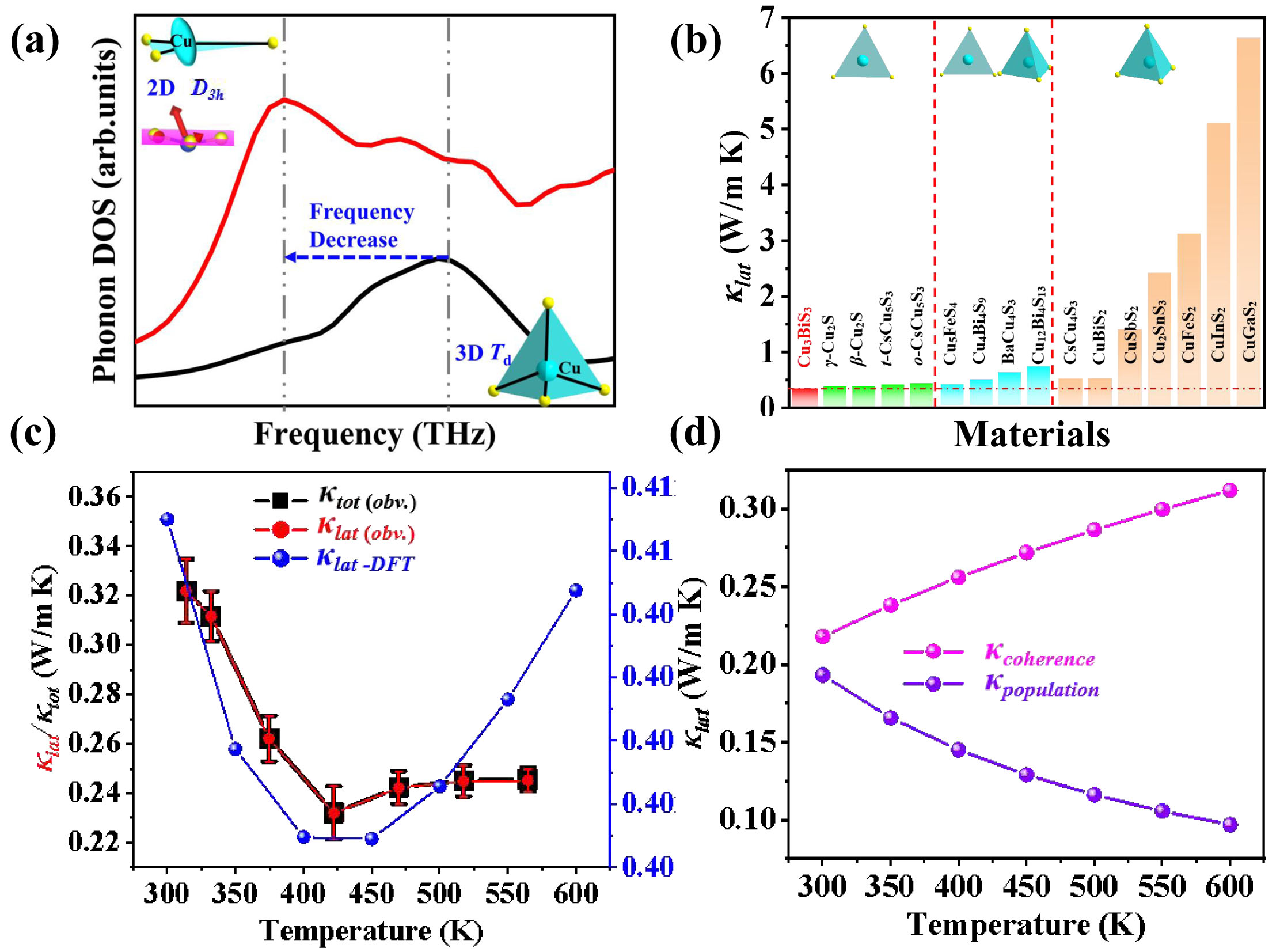 进一步系统研究表明由二维配位构型[CuS3]单元构筑的化合物均具有较低的κlat;由三维的[CuS4]单元构筑的结构,均有较高的κlat;由这两种构筑单元共同组成的结构展现出居中的κlat,说明了配位构型会显著影响材料的晶格热导率。(图b)通过变温XRD的测试,他们还发现Cu3BiS3在343 K-425 K呈现负膨胀趋势。基于Wigner 输运方程,发现Cu3BiS3具有coherence以及population两种声子输运模式(κlat = κcoherence+κpopulation),室温下κcoherence占比略微高于κpopulation,(0.22 vs. 0.19 W/m K)。而随着温度的增加,增强了coherence声子的输运,κcoherence呈增加趋势;同时温度效应也增强了类粒子声子的散射,使κpopulation减小,由于两种输运模式的协同作用,使得κlat在425 K之前呈下降趋势,之后又会呈增加趋势,从而使Cu3BiS3的晶格热导率在425 K下出现拐点。该研究揭示的二维平面配位构型声子面外散射机制,对于低晶格热导率材料的结构设计或筛选具有重要的指导意义。