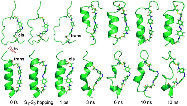 崔刚龙、方维海研究组和德国马普所Thiel教授合作,发展了一种高效的多尺度模拟方法:量子力学和分子力学(QM/MM)相结合的非绝热动力学方法,研究初期超快的激发态动力学和非绝热跃迁;但体系回到基态则用分子动力学方法模拟长时间的构象动力学。采用发展的多尺度模型,模拟了偶氮苯光异构化引起的FK-11多肽折叠和解折叠过程,发现多肽和偶氮苯之间的相互作用起着决定性的作用,不仅加速蛋白的折叠和解折叠过程、调控二级结构比例,而且影响偶氮苯的异构化过程。他们的理论研究对偶氮苯异构化和多肽折叠及解折叠过程给出了新的机理洞察,为进一步的实验和理论研究提供了重要的理论参考信息。