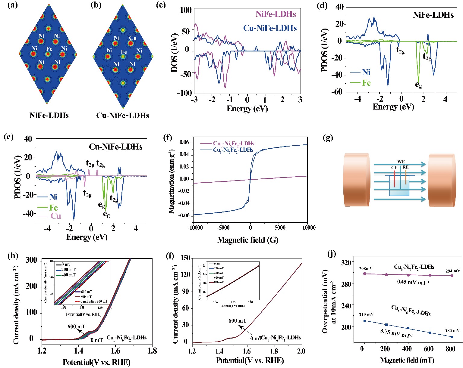 基于上述问题,51动漫 孙根班教授团队以NiFe层状双氢氧化物(NiFe-LDHs)作为碱性OER催化剂研究中取得重要进展:提出了一种新的磁性Fe3+的自旋分裂策略,如图1所示,通过Cu2+的Jahn-Teller效应有效地诱导和优化了Fe3+的电子结构和自旋态。理论计算和红外光谱揭示了O-O键的促进作用机制,提升了OH-生成O2反应效率,实现了OER高催化活性。Cu1-Ni6Fe2-LDHs催化剂在10 mA cm-2时的过电势为210 mV。如图2所示,在Cu2+的调控下,实现了NiFe-LDHs从亚铁磁体到铁磁体的转变,并首次证明了在磁场作用下,与NiFe-LDHs相比,CuNiFe-LDHs的OER性能显著提高。磁场辅助的Cu0-Ni6Fe2-LDHs在10 mA cm-2时具有180 mV的超低过电位,是目前OER性能最好的材料之一。磁场和自旋组态的结合策略为开发高性能催化剂提供了新的借鉴和支撑,并从自旋电子水平上理解了催化机理。这项工作为进一步理解磁-自旋电子学行为-电催化之间的内在联系提供了一个新的视角,进一步补充和完善了电催化自旋电子学。