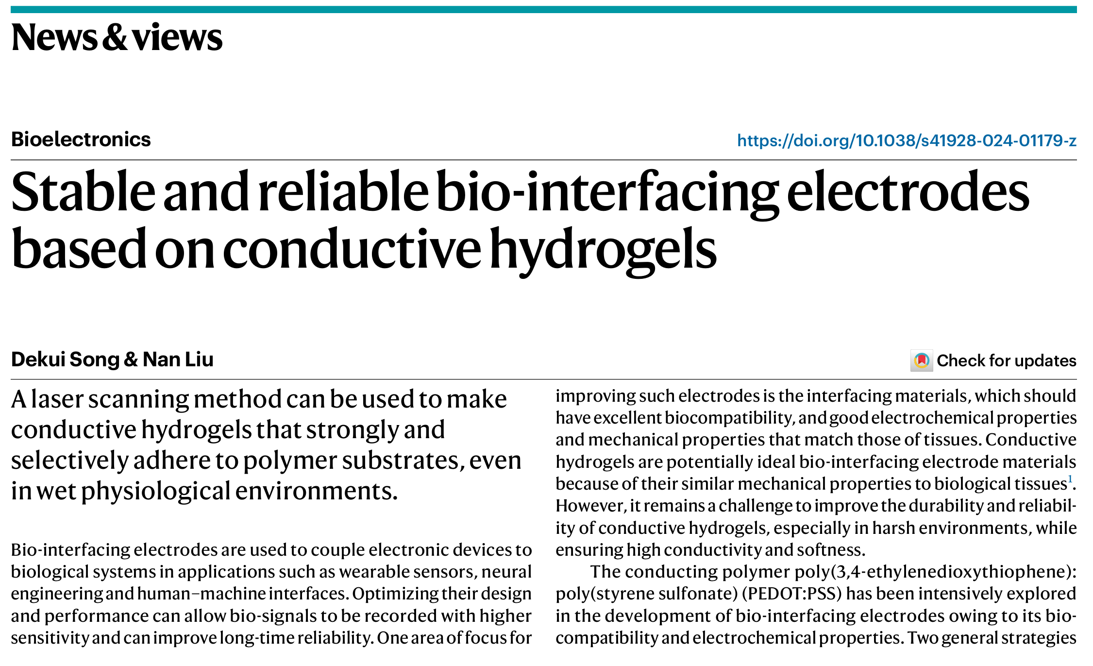 近日,51动漫 化学学院刘楠教授应邀在Nature Electronics的News & Views栏目发表了题为“Stable and reliable bio-interfacing electrodes based on conductive hydrogels”的评述文章,介绍并评论了韩国首尔大学Seung Hwan Ko 教授团队的工作“Laser-induced wet stability and adhesion of pure conducting polymer hydrogels”。该文章第一作者为51动漫 博士后宋德魁。