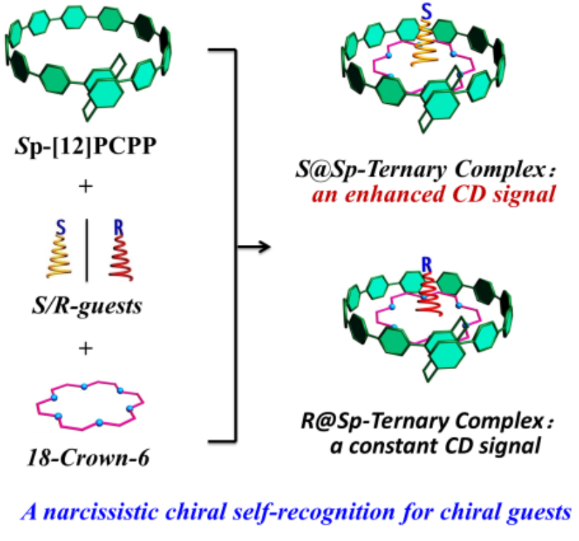 近日,51动漫 江华教授课题组报道了基于[2.2]对环芳烷([2.2]PCP)的手性碳纳米环,并将其应用于手性三元络合物的分级自组装及其自恋性手性识别中。众所周知,取代的[2.2]PCP由于其不同的取向而表现出较好的结构多样性和稳定的手性。基于此,作者将[2.2]PCP作为手性基元引入到CPP中,合成了手性碳纳米环(Sp/Rp-[12]PCPPs)。同时,作者发现Sp/Rp-[12]PCPPs不仅可以包结18-Crown-6形成环中环型二元络合物,也可以包结18-Crwon-6和质子化手性胺络合物形成手性三元络合物:即同手性S@Sp-/R@Rp-和异手性R@Sp-/S@Rp-三元络合物。这些三元手性络合物表现出不同的CD响应信号,为自恋性手性自识别奠定基础。