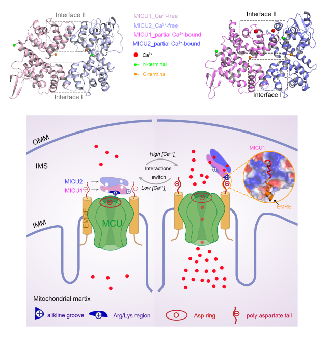 单向转运体Ca2+摄取阈值是由钙结合蛋白MICU1和MICU2共同调控的,均含有两个经典的EF-hand钙离子结合功能域。郑积敏老师课题组长期关注uniporter的研究,2019年课题组在EMBO Reports报道了MICU2的Ca2+-bound状态的三维结构。但是由于线粒体钙离子摄取体系的复杂性,钙离子的摄取机制仍旧不清楚。课题组在此研究的基础上,继续探究了MICU1-MICU2复合物的结构与功能,成功的解析出了Ca2+-free和partial Ca2+-bound两种状态的复合物的三维结构,复合物结构显示出“面对面”反平行排列的相互作用模式。通过比对两种状态MICU1-MICU2复合物的结构,揭示了其从apo到holo状态构象的变化过程。通过蛋白表面电荷分析以及微量热涌动(MST)实验鉴定了MICU1-MICU2与桥连蛋白EMRE之间的相互作用是通过MICU1蛋白的碱性口袋与EMRE的酸性C末端静电相互作用结合,并且此相互作用是钙离子依赖型,即在有钙离子存在的情况下相互作用增强。然而MICU1-MCU在无钙离子情况下相互作用增强,因此MICU1与MCU和EMRE相互转换的结合模式帮助钙离子信号完成了从调控亚基传递到离子通道,同时也揭示了MICU1-MICU2复合物 “门控”和“协同激活”两种相反功能的转换机制。最后,课题组利用外源EMRE C末端多肽竞争细胞内源EMRE,结果表明EMRE多肽降低了静息状态下MCU钙离子摄取的阈值,同时增加了刺激状态下线粒体内钙离子的积累。