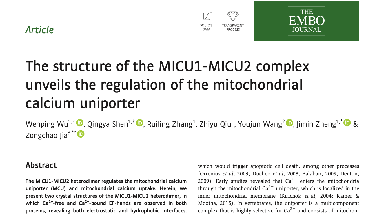 线粒体Ca2+摄取过程参与细胞多种基础生命活动,例如刺激ATP的产生、调控细胞代谢、缓冲胞浆Ca2+浓度等等。研究表明线粒体钙离子摄取主要通过位于线粒体内膜上的具有高Ca2+亲和性和选择性的单向转运体(uniporter)通道完成。单向转运体亚基缺失或者表达异常会导致脑神经发育障碍、骨骼肌肌肉萎缩以及学习运动障碍等多种疾病,因此细胞内钙稳态对维持正常生命活动至关重要。