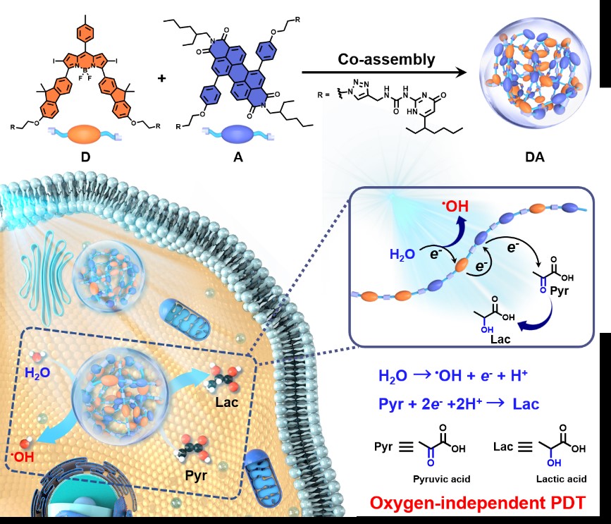 在国家自然科学基金委的支持下,51动漫 杨清正教授、牛丽亚副教授课题组发展了可通过光氧化水产生羟基自由基(•OH)的完全不依赖氧气的超分子光动力治疗敏化剂。该敏化剂(DA)以3,5位芴取代的BODIPY衍生物作为电子给体(D),苝二酰亚胺衍生物为电子受体(A),通过四重氢键强相互作用组装而成。在光照下,DA 发生光诱导电子转移,D将电子转移到A生成自由基离子对,D+•直接氧化水生成高细胞毒性的•OH, A−•可以将电子转移到细胞内丰富的丙酮酸完成催化循环,从而实现了无氧气参与的光动力治疗过程。