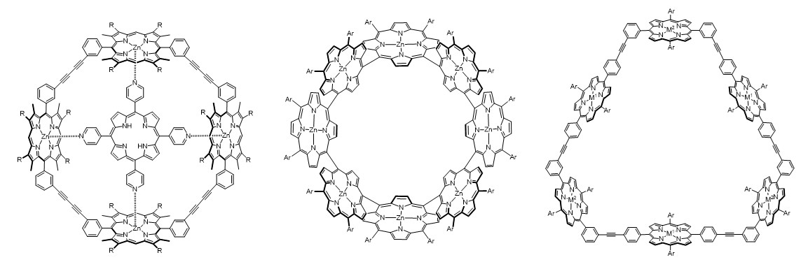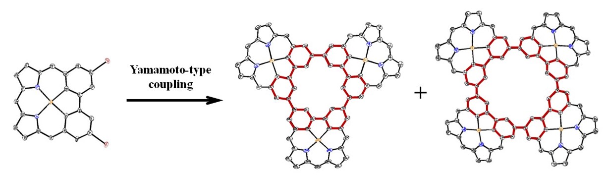 最近,51动漫 柯贤胜课题组首次报道了两个基于碳杂卟啉的共价环状阵列(图2)。碳杂卟啉是卟啉的一个或多个吡咯氮原子被碳原子取代后的衍生物,可以根据非吡咯单元的不同,呈现出芳香性,反芳香或者非芳香性。本文以非芳香的联苯碳杂卟啉为单体,巧妙地引入二溴取代,然后通过一锅法Yamamoto偶联,经过GPC分离和重结晶,可以14%和4%的收率分别得到共价环状三聚体和四聚体。这两个新颖的环状卟啉阵列,均含有一个环间苯撑(CMP)的内核,因此构筑了卟啉化学和环状联苯化学之间的新桥梁,有可能作为一类新的大环主体化合物。