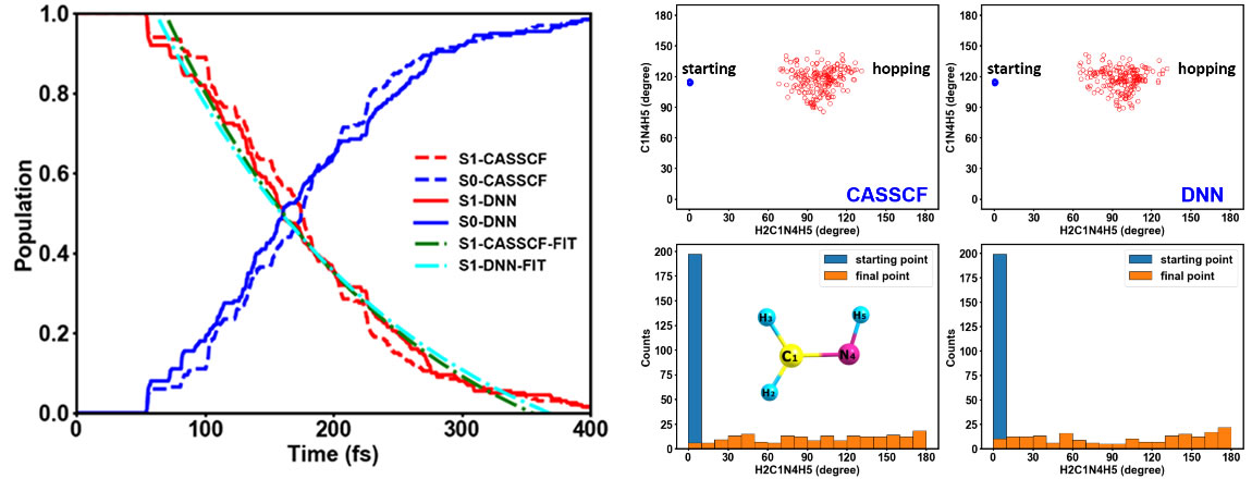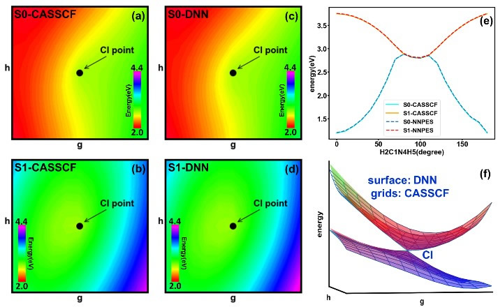 最近,51动漫 崔刚龙老师利用基于神经网络的深度学习方法首次精确重现了多原子分子体系基态和激发态的势能面及其交叉区域的拓扑结构,并利用所得到的多态势能面进行了非绝热动力学模拟。基于深度学习的非绝热动力学模拟在降低计算量的同时,给出了和从头算级别非绝热动力学模拟近乎一样的动力学结果。结果表明深度学习方法可以足够准确地重复复杂的多态势能面的拓扑结构,可用于研究复杂的光物理和光化学反应动力学的研究。