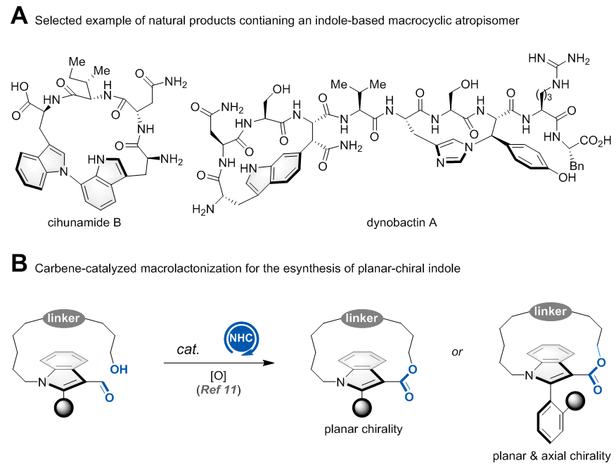 图一. 含吲哚大环阻转异构体的天然产物举例及NHC催化的大环内酯化反应
