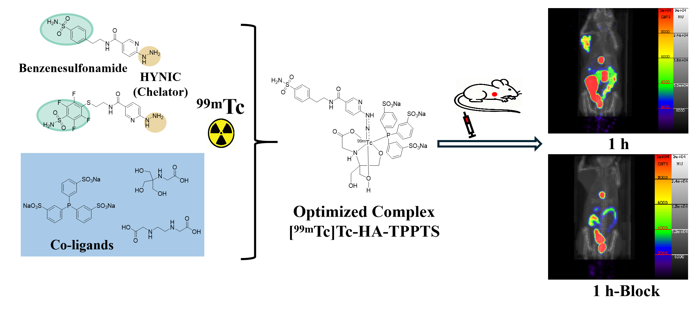 碳酸酐酶IX(carbonic anhydrase IX, CA-IX)在许多缺氧肿瘤以及透明细胞肾细胞癌中大量表达,而在正常健康组织中表达极少,通过放射性核素标记碳酸酐酶抑制剂及其衍生物用作肿瘤显像剂具有重要现实意义和临床应用价值。99mTc作为临床上最常用的SPECT核素,已被广泛用于开发靶向CA-IX的肿瘤显像剂。然而,目前报道的99mTc标记的靶向CA-IX的分子探针大多都存在肿瘤摄取低、靶与非靶比值不高的缺点。因此,开发肿瘤摄取高、显像质量优、安全有效的99mTc标记的CA-IX肿瘤显像剂具有迫切的需求。肼基尼古酰胺(HYNIC)是制备99mTc标记的小分子、多肽分子探针时常用的双功能联接剂,其可以与多种协同配体来制备稳定的99mTc 标记的HYNIC配合物。基于此,张俊波教授团队设计合成了两个含HYNIC作为螯合剂的苯磺酰胺衍生物配体,然后和协同配体tricine/TPPTS、tricine/EDDA与99mTc 配位制备得到了四个稳定的99mTc配合物。体外细胞研究表明[99mTc]Tc-HA-TPPTS显示出高的细胞摄取和与CA-IX的特异性结合。在HT-29肿瘤小鼠的生物分布实验中,配合物[99mTc]Tc-HA-TPPTS可特异性结合 CA-IX,具有高的肿瘤摄取,相比于同类分子探针显示出更高的肿瘤与非靶比值。在microSPECT/CT图像中,注射[99mTc]Tc-HA-TPPTS后肿瘤显影清晰、背景干净,展现出了广阔的临床应用前景。目前,相关成果已经获得国家发明专利授权,团队正积极开展新药临床研究,争取推动该类新型肿瘤显像剂早日进入临床应用,惠及患者。