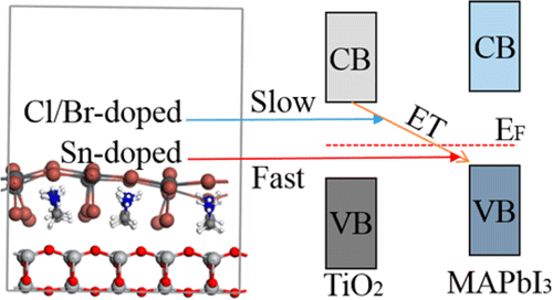 掺杂元素通常改变材料的电子性质和激发态寿命。实验发现CH3NH3PbI3|TiO2太阳能电池中,Cl/Br替代I降低界面非辐射电子-空穴复合,而Sn替代Pb提高复合率。一般地,轻元素替代重元素增强电子-振动非绝热耦合强度和加快能量损失。因此,人们认为三种元素替代均应该加快电子-空穴复合。