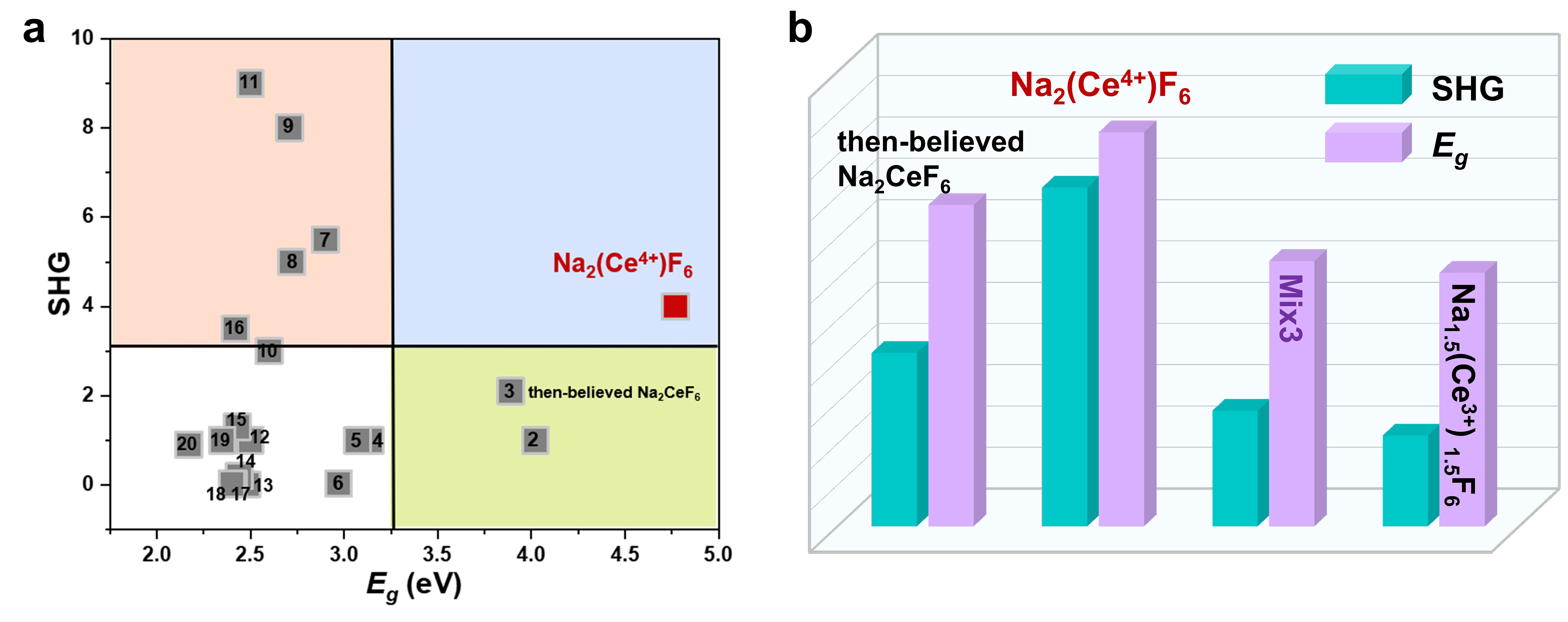 Na2(Ce4+)F6结晶于三方晶系(SG: P321),其三维框架由[CeF9]多面体与[NaF6]单元通过顶点共享构建。Ce4+-F键长显著短于还原态化合物Na1.5(Ce3+)1.5F6中的相应键长值。同步辐射分析进一步证实,纯Ce4+样品吸收边与CeO2完全吻合;而还原态则呈现典型Ce3+特征。理论计算揭示:在费米能级附近,价带顶主要包括F-2p轨道,导带底主要由Ce-4f轨道构成。 Ce4+与电负性极强的F-结合,而形成的这种独特电子结构不仅实现了Eg优化,还实现了显著的SHG增强。本研究工作的发现,为克服NLO材料领域长期存在的“不可能两者(大SHG和宽Eg)兼得”的困境提供了一条途径。这些发现为综合性能优异的材料设计合成和探索发现提供了新见解。