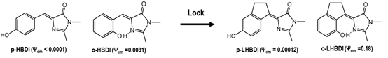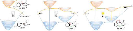 绿色荧光蛋白(green fluorescent protein, GFP)是一种在当今生命科学和医学研究中被广泛使用的示踪物,三位科学家也因对GFP的发现和研究分享2008年的诺贝尔化学奖。而与GFP极高的荧光量子产率相比,其核心发色团(p-HBDI)在溶液中的荧光量子产率极低,因此对GFP发色团及相关类似物的发光机理的研究也获得了广泛的关注(图 1)。最近,实验上通过化学修饰新合成了邻羟基绿色荧光蛋白发色团(o-LHBDI),具有显著的荧光发光效应,然而其荧光增强的机理并不清楚。