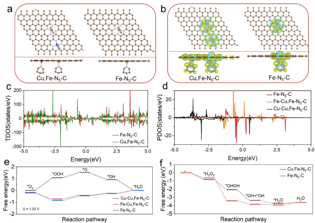 基于此,51动漫 孙根班教授团队开发了一种CuN5单原子纳米酶(SAzyme)辅助的Fe-N5催化剂,通过铜-铁双原子位点协同作用显著提升ORR性能。研究结果表明,SA-Fe-N5在碱性电解质中展现出优异的ORR活性,其半波电位(E1/2)和扩散极限电流密度(Jk)与商业Pt/C相当。如图1所示,通过DFT计算揭示了Cu-N5单原子纳米酶对Fe单原子催化剂体系的协同优化机制:(1)Cu作为电子供体通过碳骨架提升Fe位点电子密度,优化ORR中间体吸附能垒,从而提高ORR催化活性;(2)Cu-N5位点作为类过氧化氢酶优先分解H₂O₂,有效抑制Fe引发的芬顿反应,进一步提高ORR催化稳定性。如图2所示,通过配体-介导法成功合成Fe/Cu双原子催化剂,通过EXAFS拟合确认Cu-N5和Fe-N5的配位构型,最终确定Fe-N5/Cu-N5双原子位点。如图3所示,优化后的SA-Fe-N5在碱性电解质中中达到0.89 V(vs. RHE)的半波电位,其性能超越传统商用Pt/C和Fe-N5。关键创新在于引入Cu位点有效抑制Fe位点的类芬顿效应,使羟基自由基(·OH)生成量降低。电化学稳定性结果表明,SA-Fe-N5催化剂经10000次循环后半波电位衰减仅7.2 mV,显著优于Fe-N₅(34 mV)。作为锌-空气电池阴极催化剂,SA-Fe-N5实现了217.8 mW cm-²的峰值功率密度和808.7 mAh g-1的比容量,在10 mA cm⁻²下稳定循环110小时,展现其商业化应用潜力。本研究将理论研究与实验验证相结合,为进一步设计高耐久、低成本ORR电催化剂提供了创新策略和新的视角。