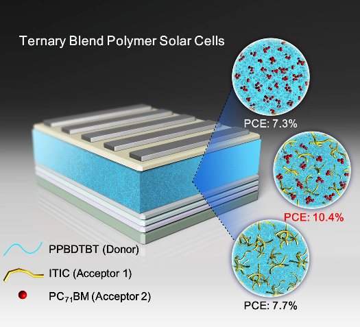 学科交叉项目等的支持下,薄志山教授带领的研究团队在聚合物光伏材料与器件等方向取得突破性进展。最近他们提出了利用超分子作用构筑非富勒烯受体的设想,设计合成了基于超分子稠环结构的非富勒烯受体,这种超分子稠环受体分子在溶液中具有较大的溶解度,而在薄膜中形成超分子稠环结构之间了平面性,可以通过材料的电子迁移率。以这种超分子稠环受体构筑的聚合物光伏电池,取得了9.6%的能量转换效率,为设计和合成新型高效率、低成本受体分子提供了新思路,该工作以Communication发表在J. Am. Chem. Soc., 2017, 139 (9), 3356–3359。该课题组还在聚合物太阳电池器件方面取得了重大突破,发展了一种三元体系的聚合物光伏电池,即采用共轭聚合物为给体材料、富勒烯衍生物PC71BM和非富勒烯分子ITIC为受体,ITIC可以大幅度拓宽活性层的光吸收、PC71BM可以有效的调节活性层的形貌,从而使得三元体系光伏电池的能量相比于二元体系获得了35-40%的提高,达到了10.4%,该工作发表在Advanced Materials(2016,28,9559)上,文章发表后,引起了国内外广泛的关注,Nature Index的影响力指数(Altmetric score)达到了58。