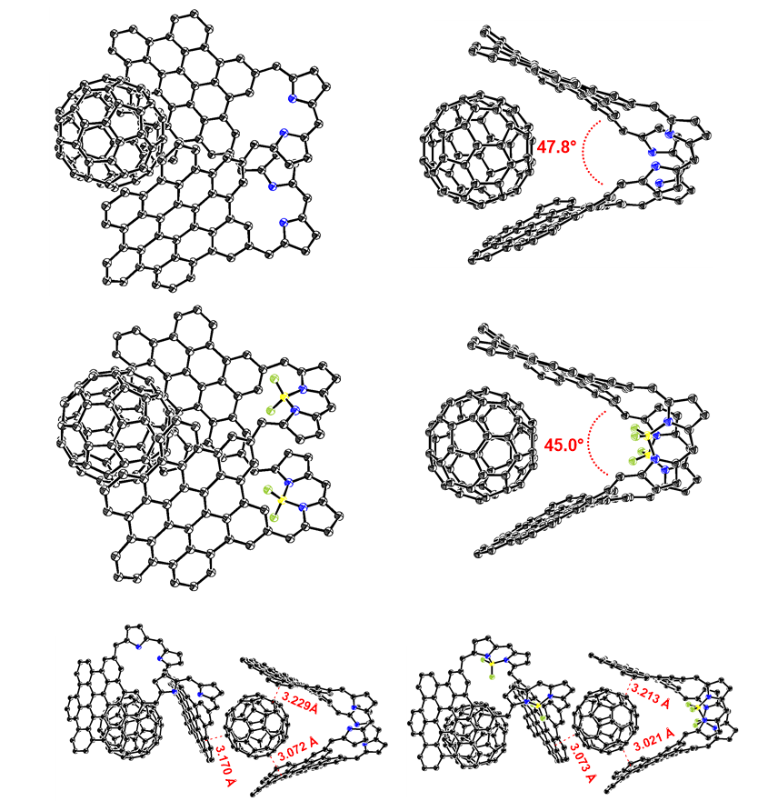 图二. 分子镊子与C60主客体络合物的晶体结构以及它们之间的相互作用。