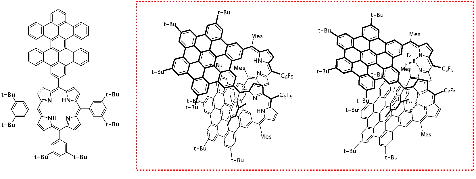 碳杂卟啉是一类卟啉内核氮原子被碳原子取代后的衍生物,其往往表现出与传统卟啉不同的结构、芳香性以及配位能力。目前已有多种小尺寸多环芳烃如萘、蒽、菲、芘等被引入碳杂卟啉的骨架中。然而,更大尺寸的多环芳烃,比如纳米石墨烯,还未参与构建碳杂卟啉。这二者的结合,将会促进纳米石墨烯化学和卟啉化学新的交叉融合,并且可能赋予二者崭新的性能。在合成方面,尽管前人已经报道了经典的纳米石墨烯——六苯并蔻与卟啉的共价相连的体系,但是这些体系基于完整的四吡咯卟啉和六苯并蔻的结合(图一左),而把纳米石墨烯真正“融入”卟啉骨架,从而构建碳杂卟啉还是一个未知的挑战。