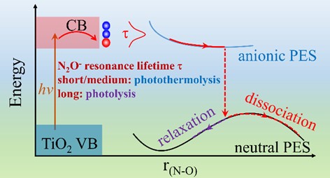 图1. TiO2光催化分解N2O示意图,N2O-共振寿命决定了反应的机理。