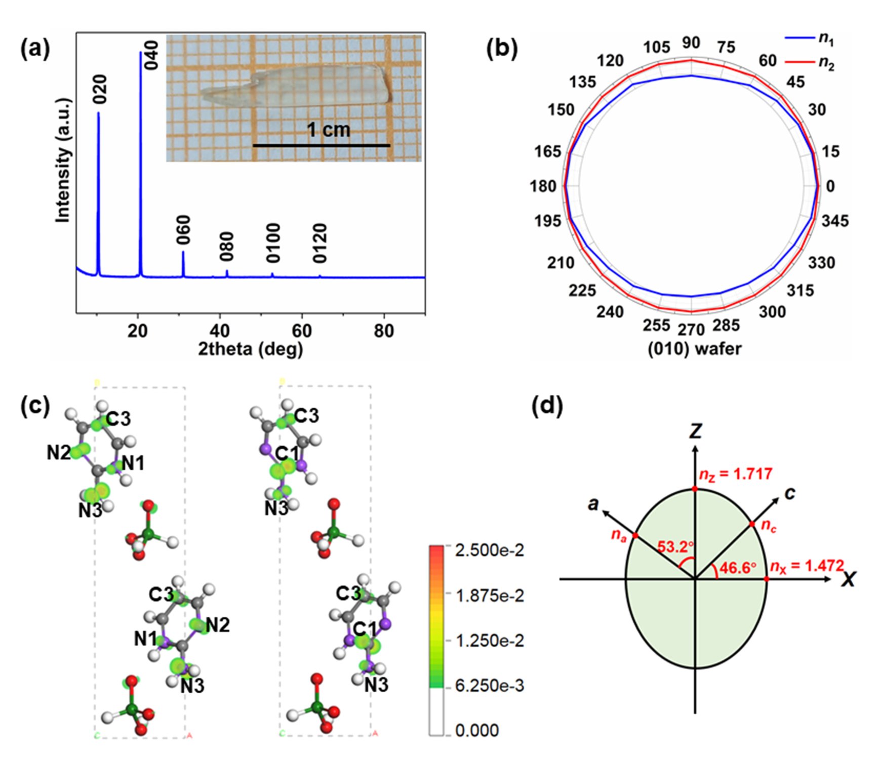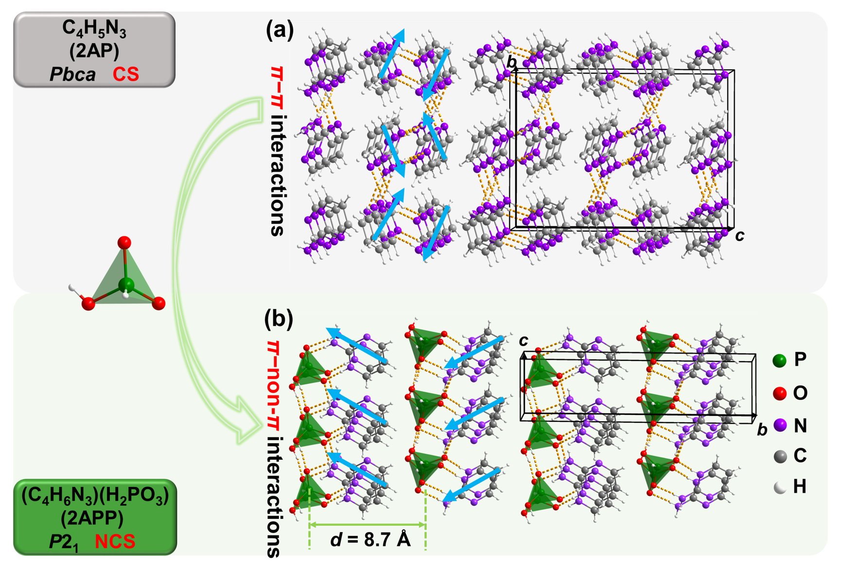 基于这些思考,他们在晶体结构中,利用无机阴离子基团(H2PO3)−实现了对(2AP)+基团的有效分隔,成功避免了由于有机基团的偶极-偶极相互作用形成的“中心结构陷阱”,获得了一例非中心对称的NLO晶体:(C4H6N3)+(H2PO3)−,2APP,该化合物展示了优异的非线性光学性能。此外,该工作首次明确了计算单斜及三斜晶系的折射率时,程序需要读取对角化矩阵中的介电常数,从而才能正确地计算折射率。这对于折射率的计算研究具有里程碑意义。通过上述方法计算的(010)晶面内双折射率为0.245,与实验值[email protected] nm吻合。研究表明,2APP呈现较强的SHG响应(2 × KDP),激光损伤阈值高(LIDT = 1.7 × KDP);热稳定性好(166 °C),是目前不含金属元素的(2AP)类化合物的最高值之一。特别是:该晶体结构中独特的层状结构由于修饰了单一取向的(2AP)+发色团,紫色荧光量子产率得到了显著的提高 (2APP:Φ = 30.6%),比纯2AP及其衍生物提高了三个数量级。