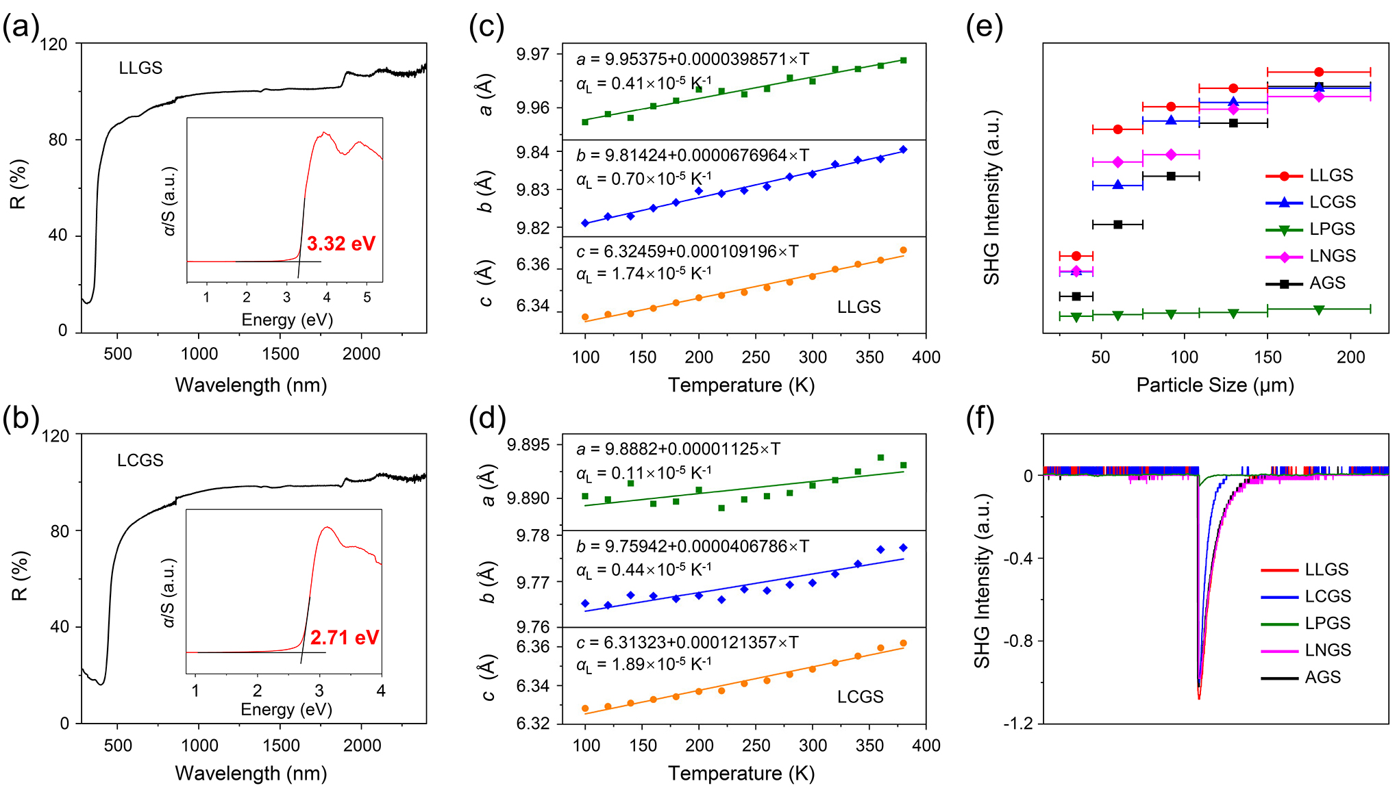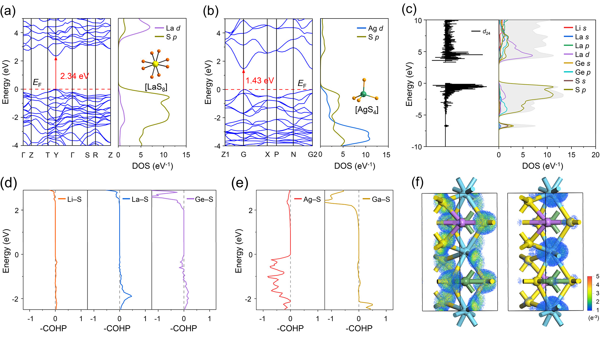 针对上述科学问题,我们课题组提出“能带工程改造AGS”策略,旨在主动修饰AGS的能带结构,实现以下三个目标:首先,增加带隙;其次,解决Ag-S键易断裂的问题,提高化合物稳定性,减缓热膨胀行为;最后,增加费米能级附近S非键轨道的贡献,从而增强SHG。基于该策略,采用我们课题组2004年提出的硼硫化法(J. Am. Chem. Soc. 2004, 126, 4676-4681;J. Am. Chem. Soc. 2021, 143, 18490–18501),成功获得了四例新型镧系硫化物LiLnGeS4 (Ln = La−Nd)。对LiLaGeS4(LLGS)的研究表明,通过(Li+ + La3+)组合完全取代Ag+离子,一方面消除了Ag-4d轨道在能带结构中对带隙的负面影响,使得化合物带隙增大到3.32 eV,从而增强了LIDT(14−29 × AGS);另一方面,由于La/Li的电负性低于Ag,La-S/Li-S键的离子性比Ag-S键更强,这有助于增加S-3p非键轨道的态密度,从而实现了dij的增强(SHG = 1.06 × AGS)。此外,由于LLGS不含Ag元素,如预期般,其热膨胀行为极小(沿a、b、c轴,线热膨胀系数分别为αL = 0.41、0.70、1.74 × 10-5 K-1),比AGS降低了近一个数量级。同时,[LiS4]、[GeS4]和[LaS8]结构单元间的键长差异还赋予材料具有较大的结构各向异性,从而产生适中的双折射(Δn = 0.052),这一特性有助于材料实现SHG相位匹配。
