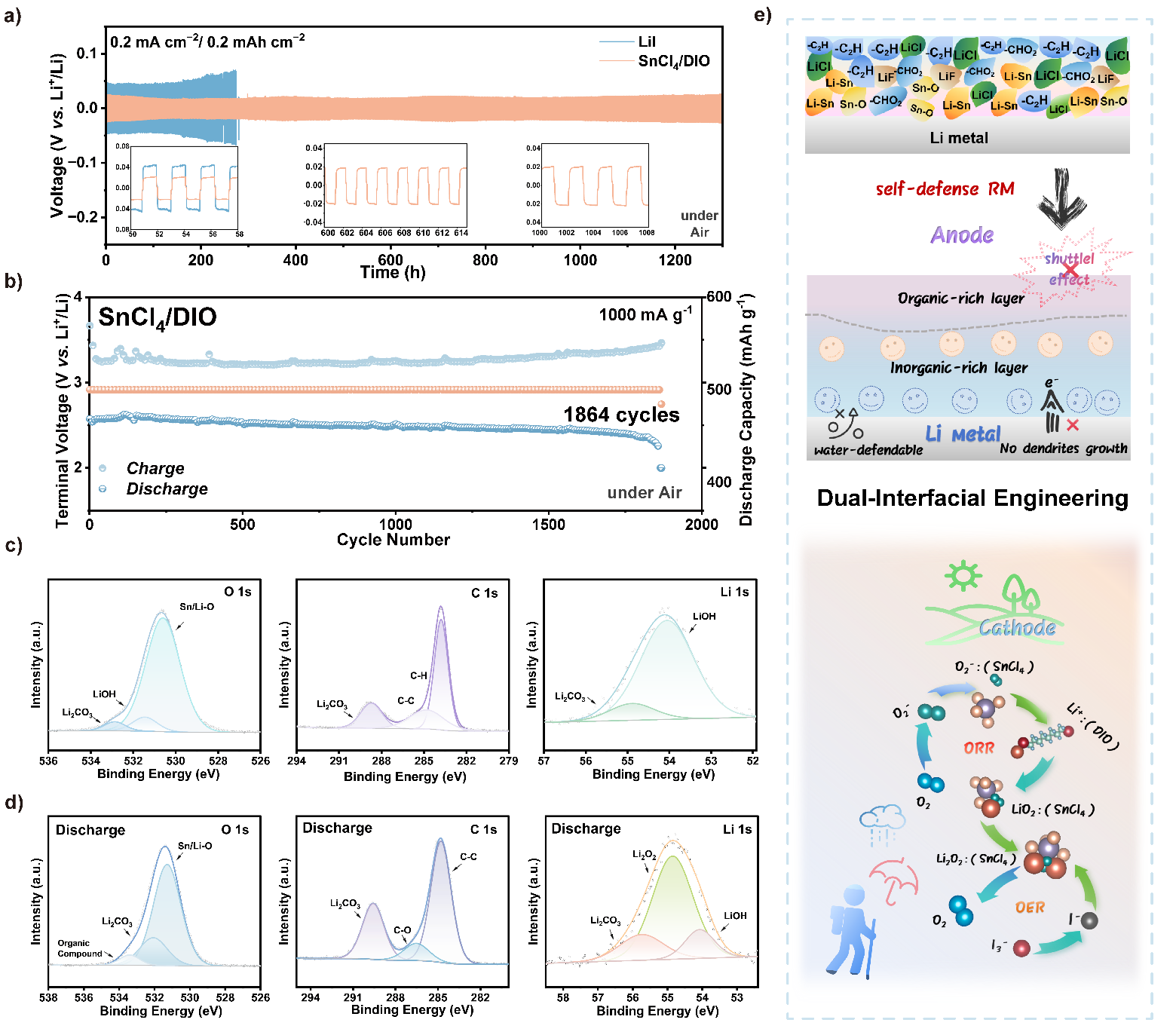 该策略使锂空气电池在无需控湿的潮湿空气环境中(RH=50%~55%),于1000 mA g⁻¹高电流密度下实现了1864次(超过2160小时)的超长循环寿命,显著拓宽了其实际应用的环境适应性。该研究为解决长期制约锂金属空气电池实际应用的环境湿度问题,提供了创新且高效的解决方案,为设计下一代高能量、高环境耐受性的金属空气电池系统指明了新方向。