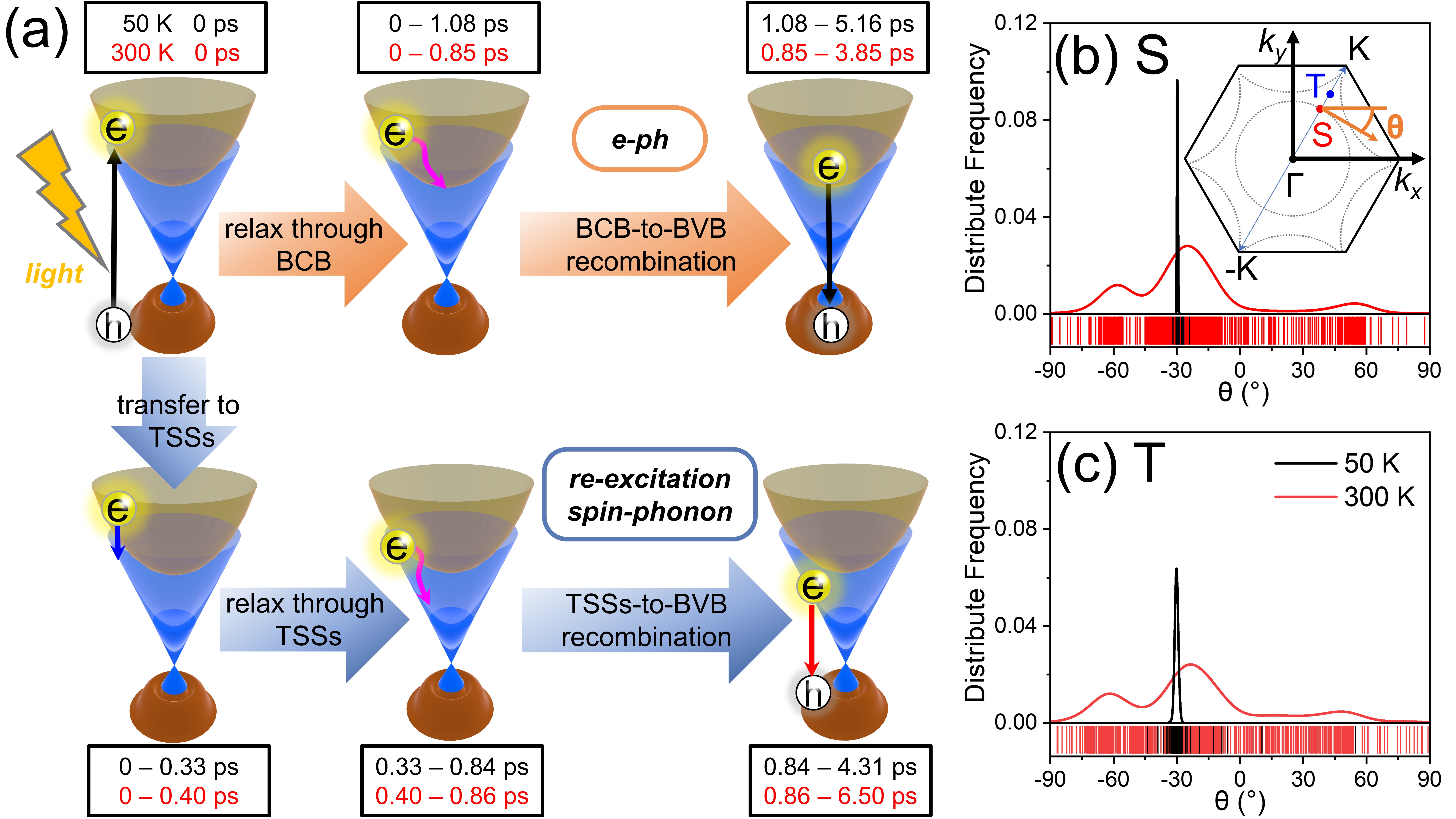图1. (a) Bi2Te3载流子动力学模型,橙色箭头代表体路径,蓝色箭头代表表面路径。(b) 和(c) 分别为S点和T点自旋向量方向θ的统计分布图。
