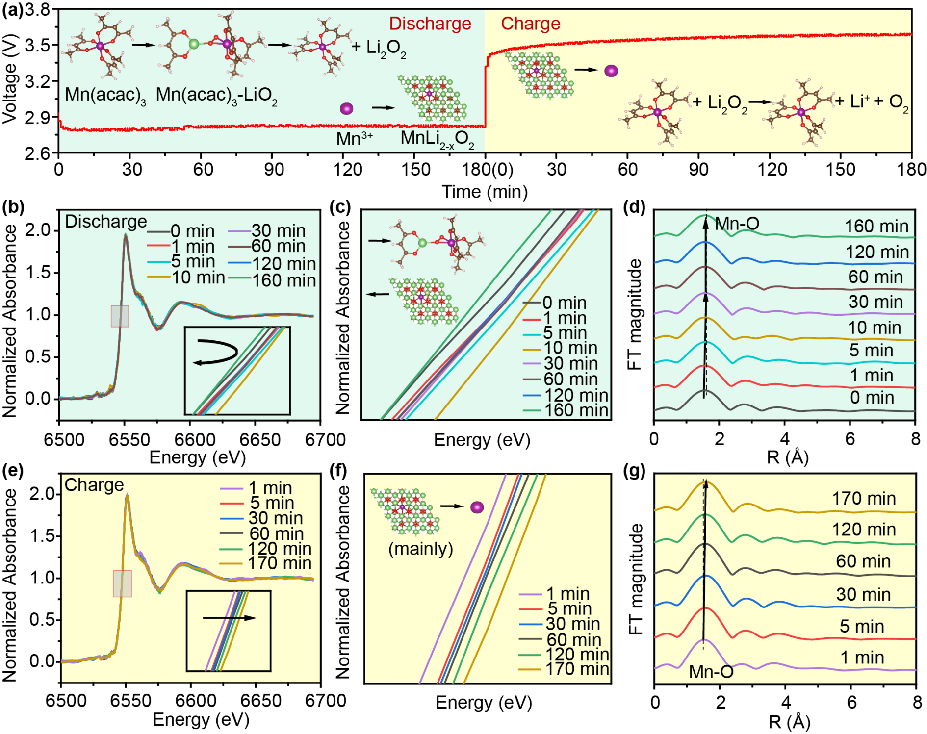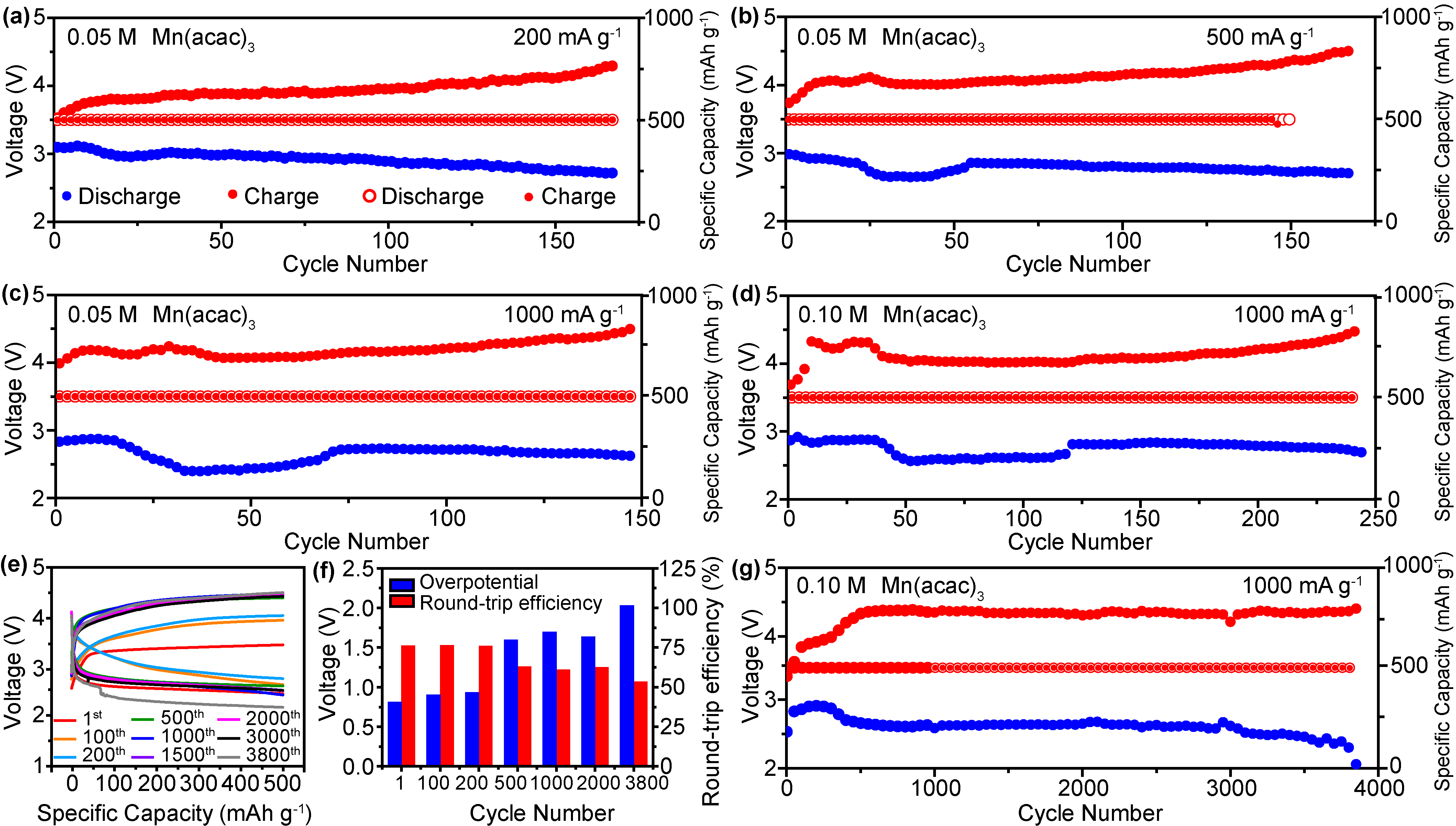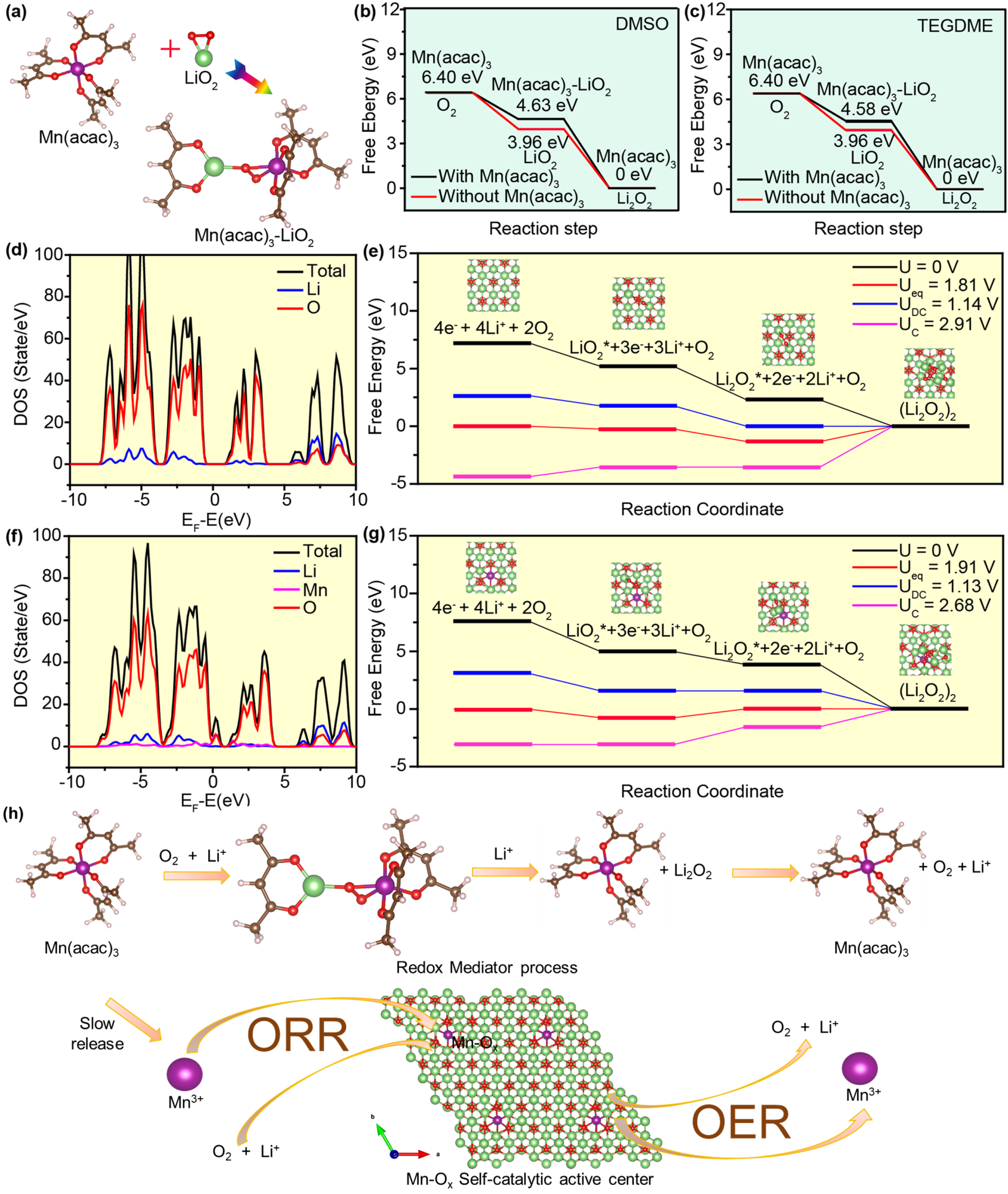 基于此,51动漫 孙根班教授团队提出了一种自催化与氧化还原媒介协同耦合的超长循环寿命的锂空气电池体系。采用具有弱电解质性质的有机金属盐作为双功能添加剂,耦合自催化体系与中间产物反应路径的优化,使乙酰丙酮盐在Li-O2电池中表现出作为过渡金属阳离子和氧化还原介质的双重特性。如图1所示,在Mn3+和Mn(acac)3分子共存的情况下,金属离子可以通过原位电化学植入法,经过还原后,掺杂进入Li2O2,形成放电产物Mn-Li2-xO2,从而改变其绝缘性能。此外,有机金属盐作为液相氧化还原介质(RMs),有效捕获和稳定中间相LiO2,形成复杂结构Mn(acac)3-LiO2,在充电过程中不仅能够稳定中间体LiO2,还能促进中间体进一步转化生成Li2O2,并增强分解反应,这一点通过原位同步辐射和紫外可见光谱得到进一步证实。含有Mn(acac)3的Li-O2电池显示出0.43 V的超低过电位,并在1000 mA g-1下能够维持250次长循环。如图2所示,当结合反应环境优化策略,可在1000 mA g-1下实现3850次的长循环稳定性。通过理论计算模拟,提出了利用Mn(acac)3的Li-O2电池的ORR和OER机制。如图3所示,揭示了氧化还原介质的作用以及基于分子形式Mn(acac)3和电化学植入的活性Mn-Ox簇的自催化反应机制,进一步证实了自催化体系与氧化还原媒介协同耦合的机理,为设计先进的超长寿命锂氧气电池系统和提高其电池关键性能提供了新的见解。