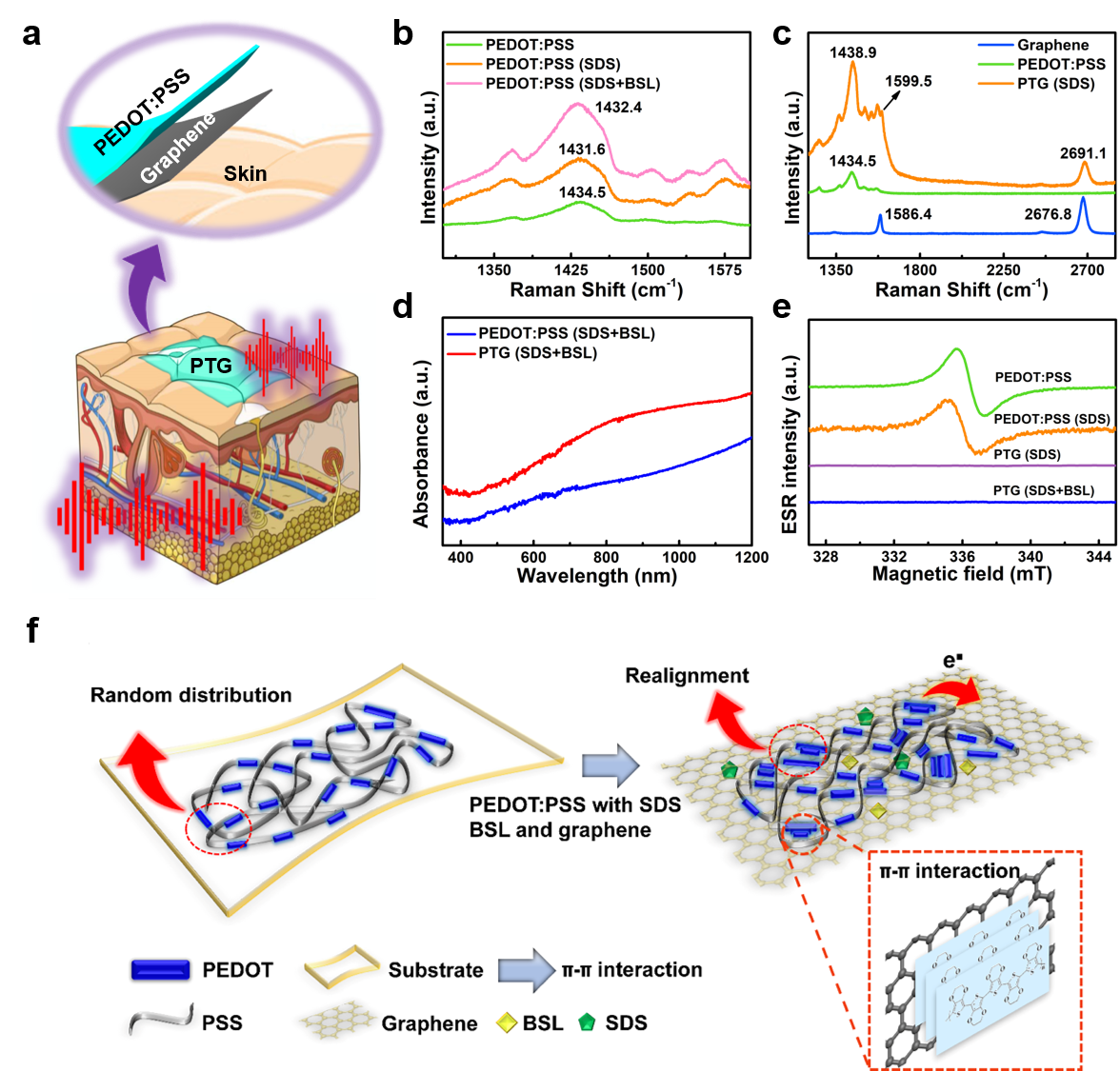 图1 基于石墨烯和PEDOT:PSS协同相互作用的表皮电生理电极示意图。(a)PTG电极结构示意图;(b-e)拉曼光谱、紫外可见近红外光谱、电子自旋共振光谱表征;(f)石墨烯/PEDOT:PSS的π-π相互作用。