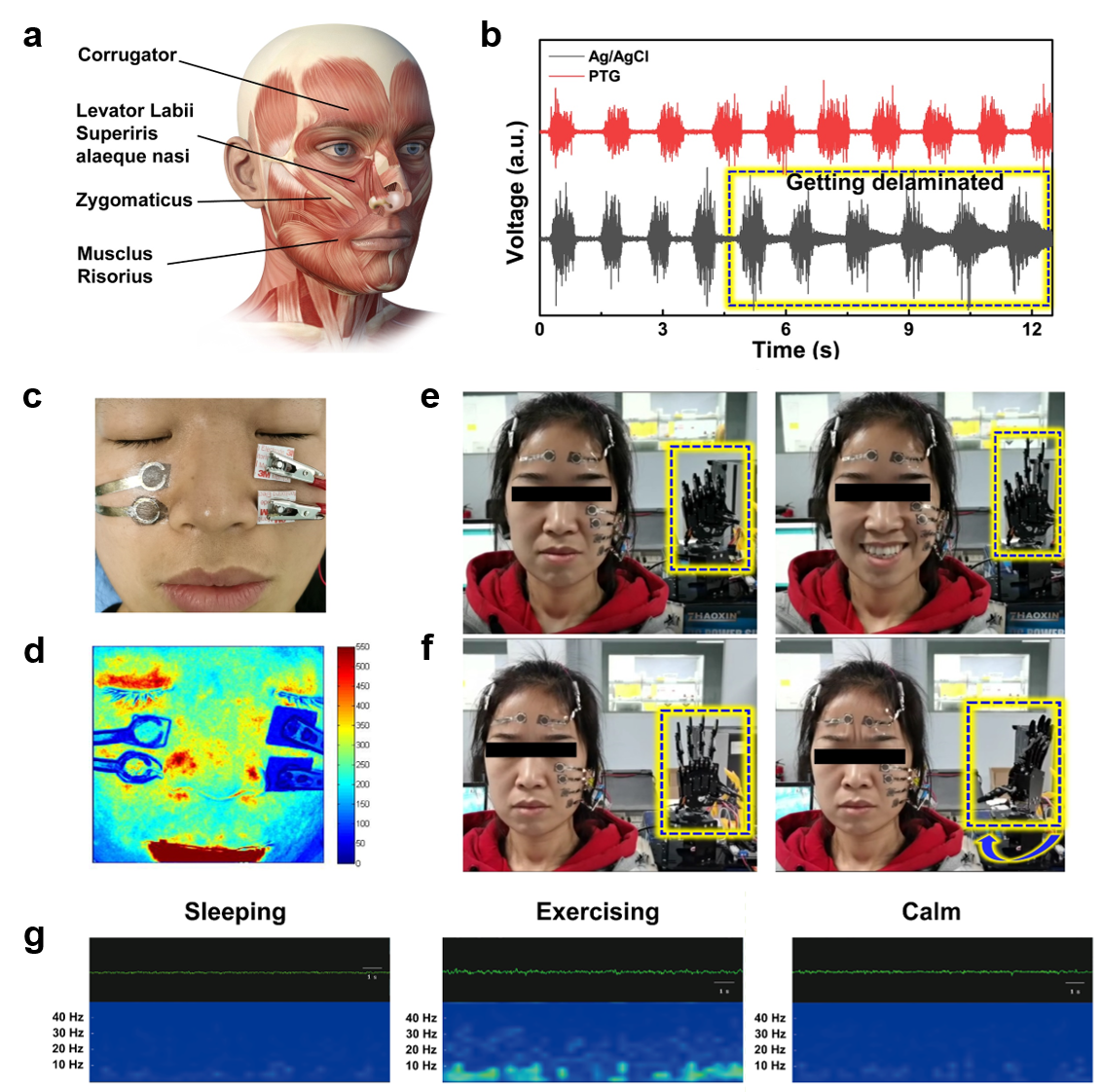 图2 PTG电极在表皮电生理信号采集方面的应用。(a-f) PTG电极在面部肌电、面瘫治疗和基于面部表情的人机交互中的潜在应用;(g) PTG电极长时间监测脑电信号。